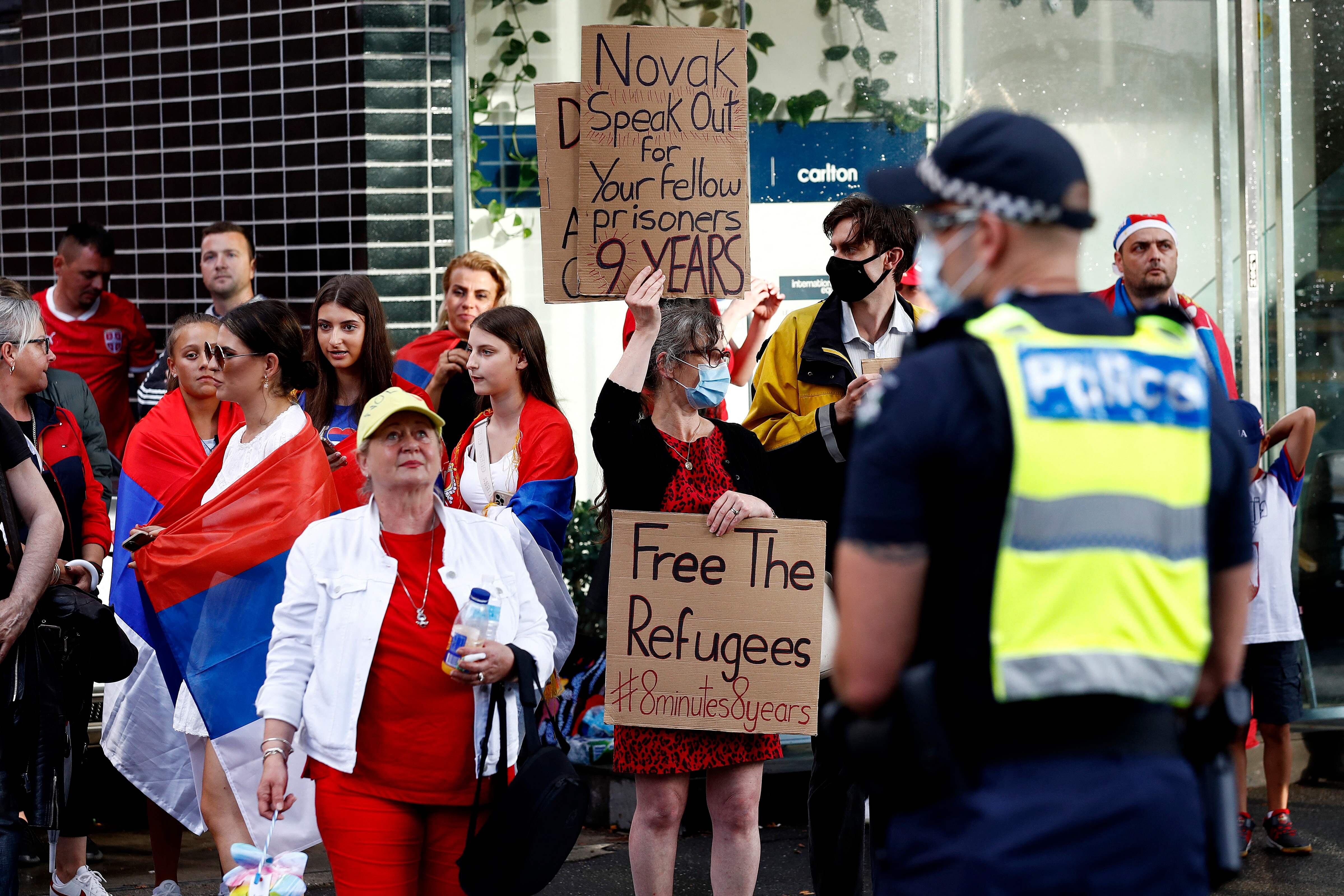 Desafiando la lluvia, medio centenar de personas –entre aficionados al tenis, manifestantes antivacunas y defensores de los derechos de migrantes– se congregaron en el día de Navidad ortodoxa, en el exterior del centro de retención en Melbourne. ”Hemos venido a apoyarlo porque es nuestra Navidad, y lo está pasando mal” dijo Sash Aleksic, delante de las instalaciones.