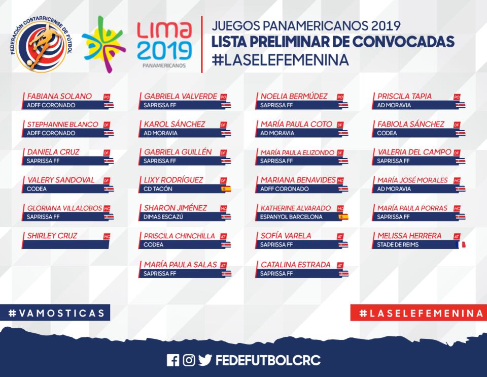 Por otra parte, las nacionales que juegan en el exterior y estarán en los Juegos Panamericanos son: Lixy Rodríguez, Shirley Cruz, Katherine Alvarado y Melissa Herrera. El torneo panamericano, no se realiza en fecha FIFA, por lo que la Selección tendrá algunas bajas como la de Raquel Rodríguez y la arquera Daniela Solera.