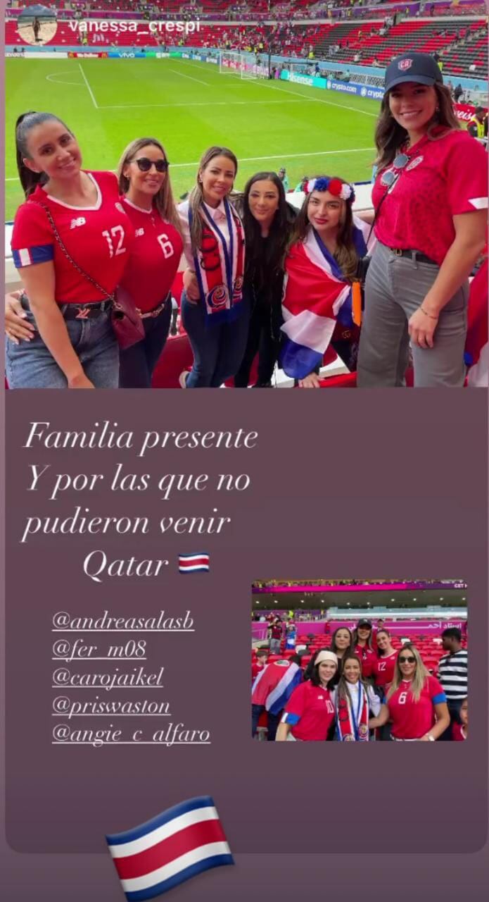 Junto a Salas se encontraba Vanessa Crespi, esposa del defensor Oscar Duarte. Ella desde las 4 a. m. empezó a compartir historias de la entonación de los himnos, videos de su pequeño hijo Matías emocionado en el estadio, así como una sentida celebración junto a la marea de los ticos cuando el gol nacional cayó al minuto 80. “Familia presente”, escribió.