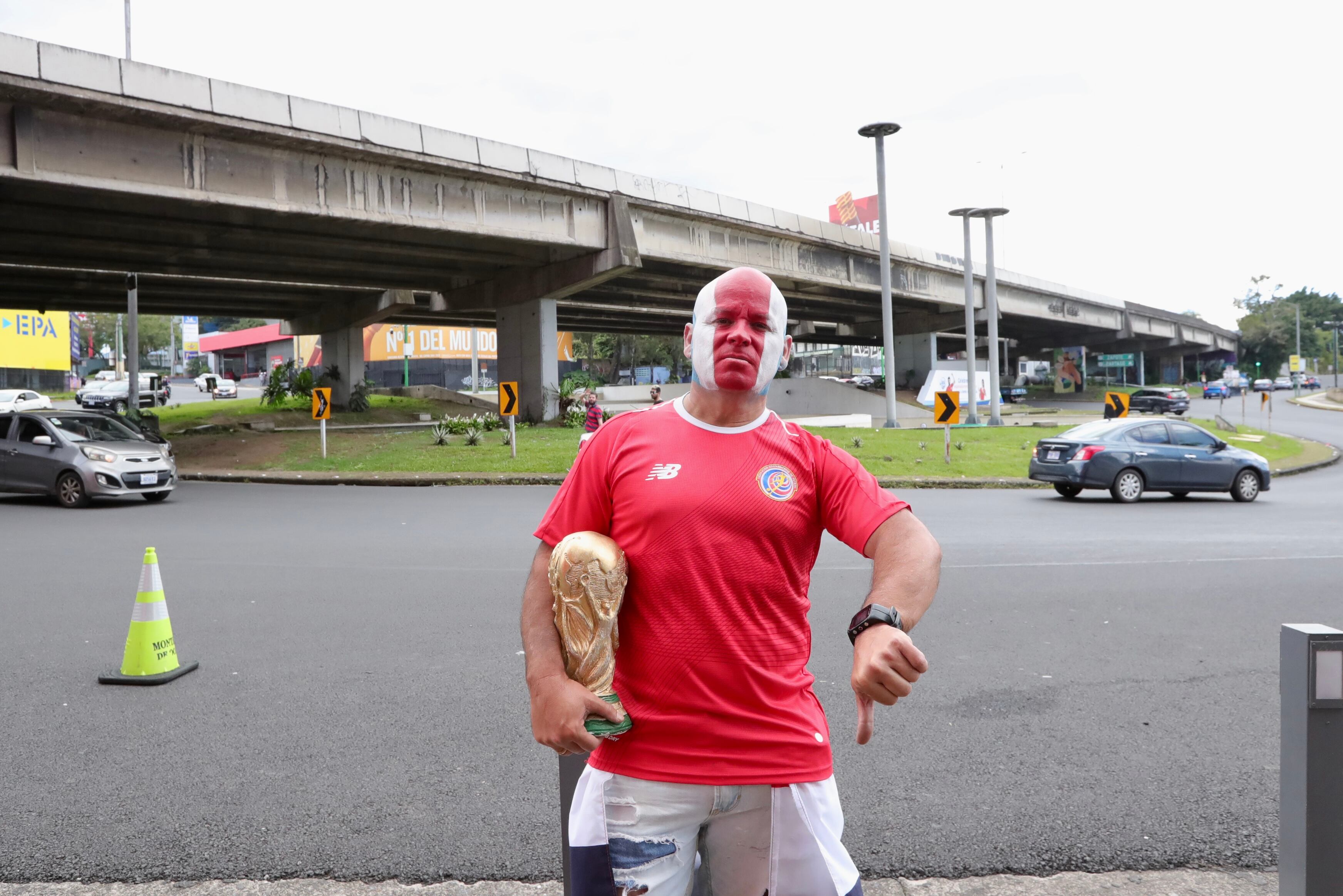 Uno de los pocos aficionados ticos que se quedó hasta el cierre del partido fue un Henry Fonseca, quien destacó por su cabeza pintada con los colores blanco, azul y rojo. Además, se amarró su bandera en la cintura y portaba un trofeo de la Copa del Mundo que se mira a años luz para el combinado patrio.