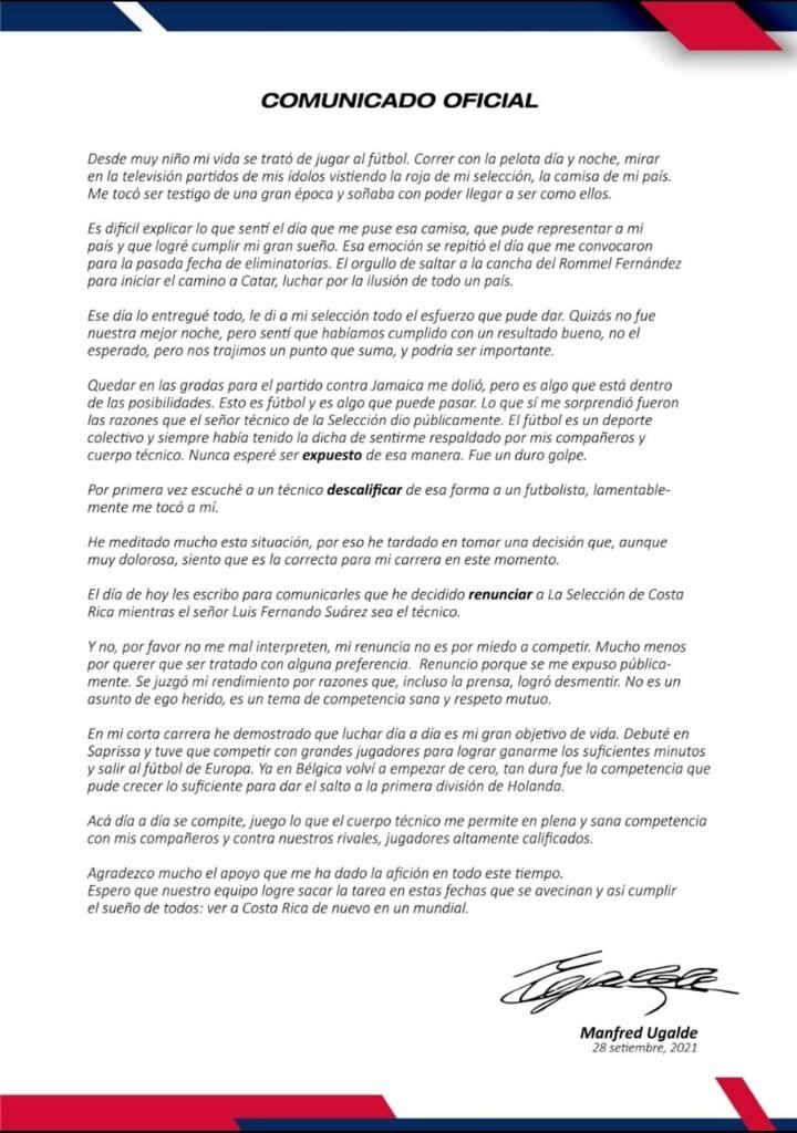 “El día de hoy escribo para comunicarles que he decidido renunciar a la Selección de Costa Rica mientras el señor Luis Fernando Suárez sea el técnico”, afirmó el atacante.