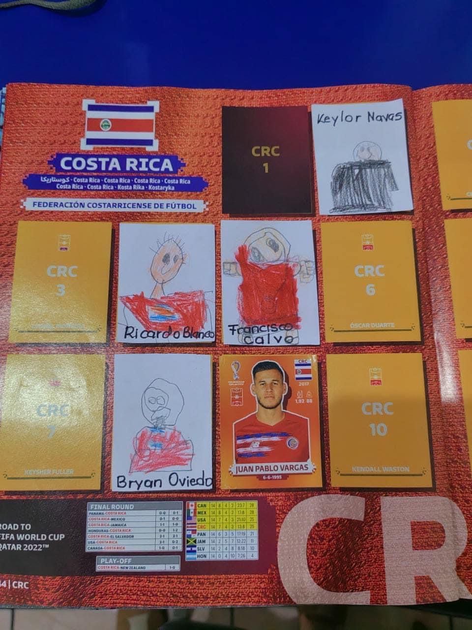 Otro estudiante del grupo de 21, todos entre los 4 y 5 años, a cargo de la maestra Laura Víquez Murillo, dibujó con sus propias manos a Bryan Oviedo. Pintó con lápiz de color su camisa rojiazul y el esbozo de una sonrisa sobre el rostro del jugador. Las imágenes están pegadas en el álbum Panini del Mundial Qatar 2022, junto a las de Messi, Neymar o Ronaldo, todas ellas dibujadas y pintadas por estos pequeños de materno.