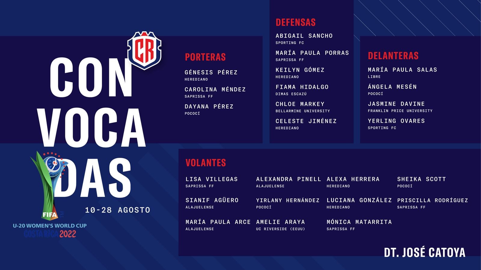 El técnico de la Selección Nacional Femenina Sub-20, José Catoya, dio a conocer la lista de jugadoras convocadas para el Mundial Femenino Sub-20 Costa Rica 2022. Saprissa y Herediano aportan cinco jugadoras cada uno, mientras que Pococí cuatro y Alajuelense tres.