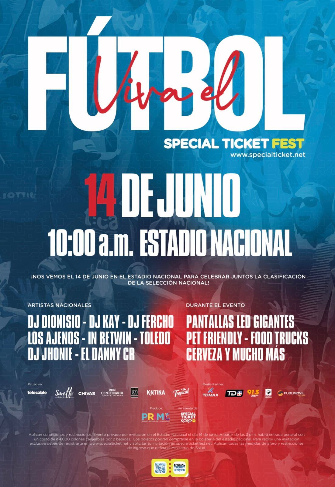 En el evento denominado “Viva El Fútbol Special Ticket Fest” que se efectuará en la explanada del Estadio Nacional. El Special Ticket Fest está conformado por dos etapas, la primera es la transmisión del partido para las 3 mil personas que participaron por su entrada en las dinámicas de Special Ticket. Los interesados se registraron en el sitio web de Special Ticket, ya no hay boletos disponibles. Quienes obtuvieron el tiquete disfrutarán del partido en pantallas gigantes ubicadas dentro del Estadio.