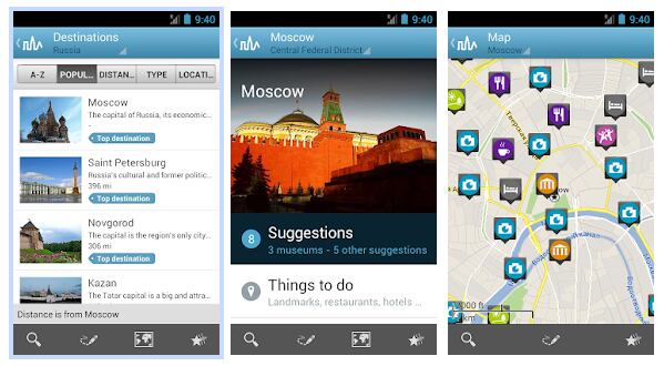 Russia Travel Guide by Triposo: Esta app ofrece son guías de cada ciudad del país, con mapas e información para visitar los monumentos más importantes y una selección de los mejores restaurantes. La aplicación está disponible en varios idiomas y se puede usar sin conexión a Internet.