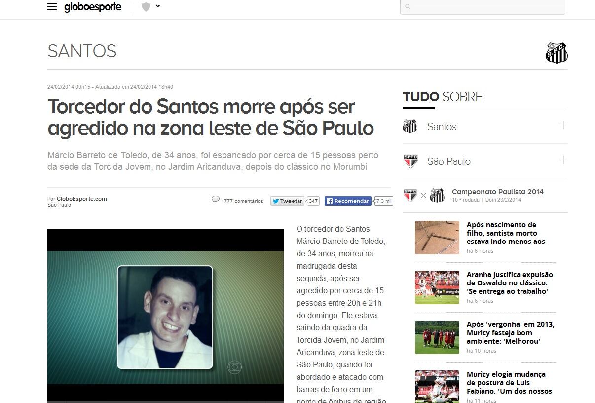 La víctima fatal, Márcio Barreto de Toledo, esperaba la noche del domingo el bus para volver a casa cuando fue abordado por 15 sujetos, supuestamente vistiendo la camiseta del Sao Paulo.
