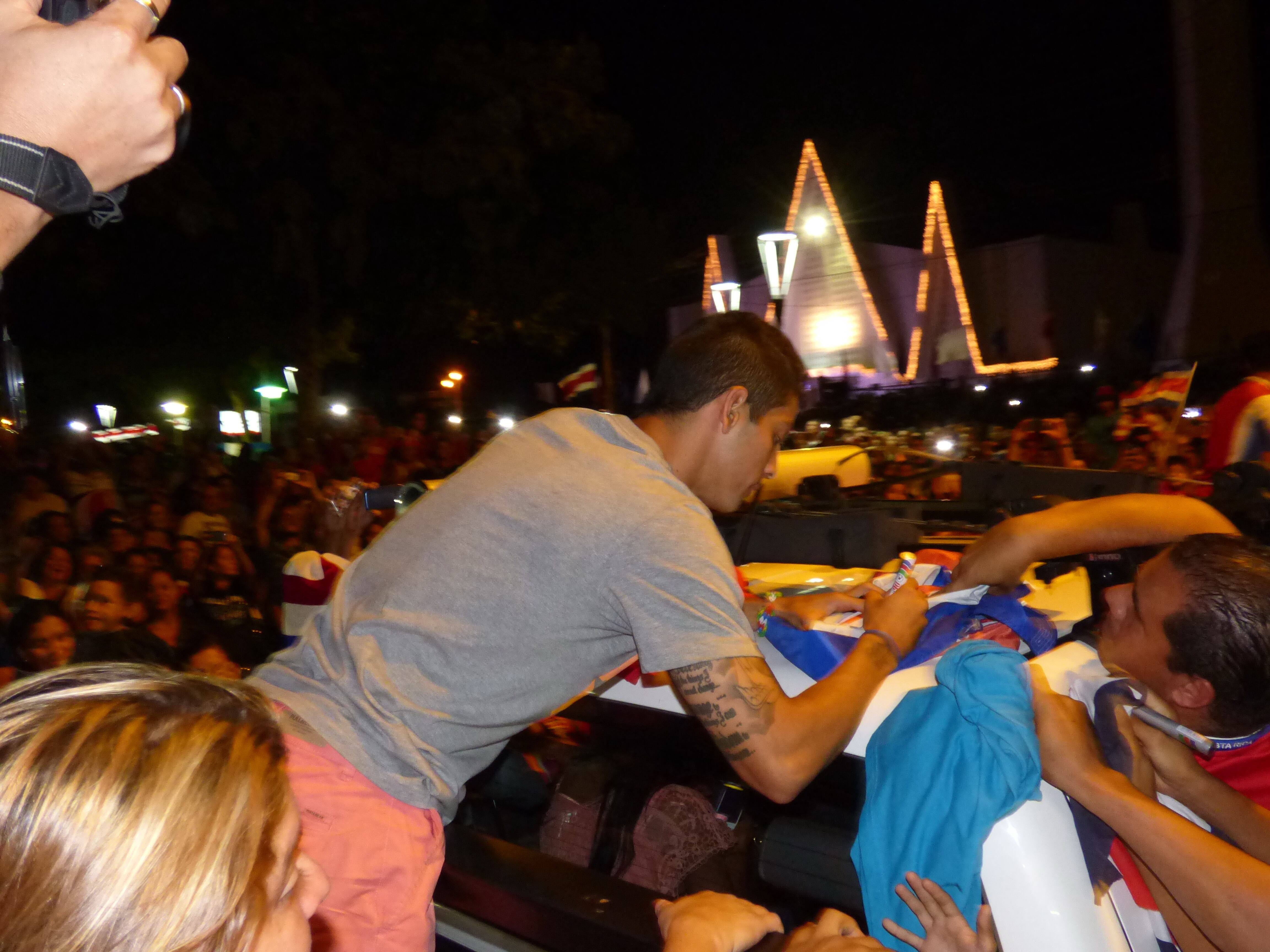 El sacerdote Eithel Masís pidió que se abrieran las puertas del templo y por ahí el defensa subió a la tarima para saludar a una muchedumbre enloquecida. Para los guanacastecos, la del miércoles fue una noche llena de emoción.
