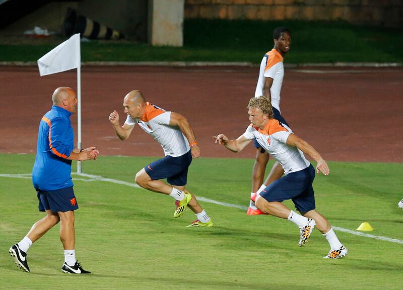 Con los chalecos naranjas, esos del mismo color que tendrán sus camisetas hoy, corrían Arjen Robben, Robin Van Persie, Wesley Sneijder, Memphis Depay... Y ojo al verbo empleado: corrían.