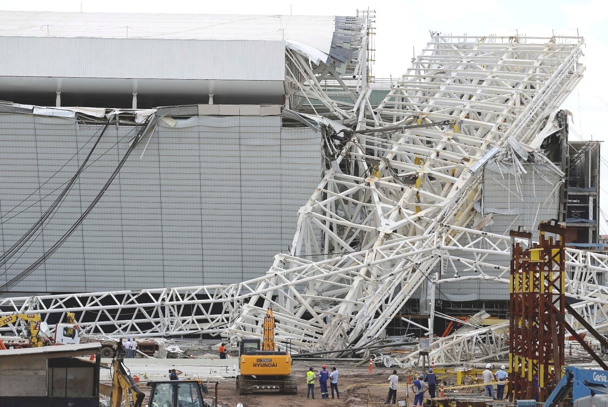 El miércoles, cuando una grúa se disponía a poner la última parte de la estructura metálica del techo, la pieza, de un peso de 420 toneladas, cayó provocando daños en parte de las gradas y en una fachada construida con tecnología LED.