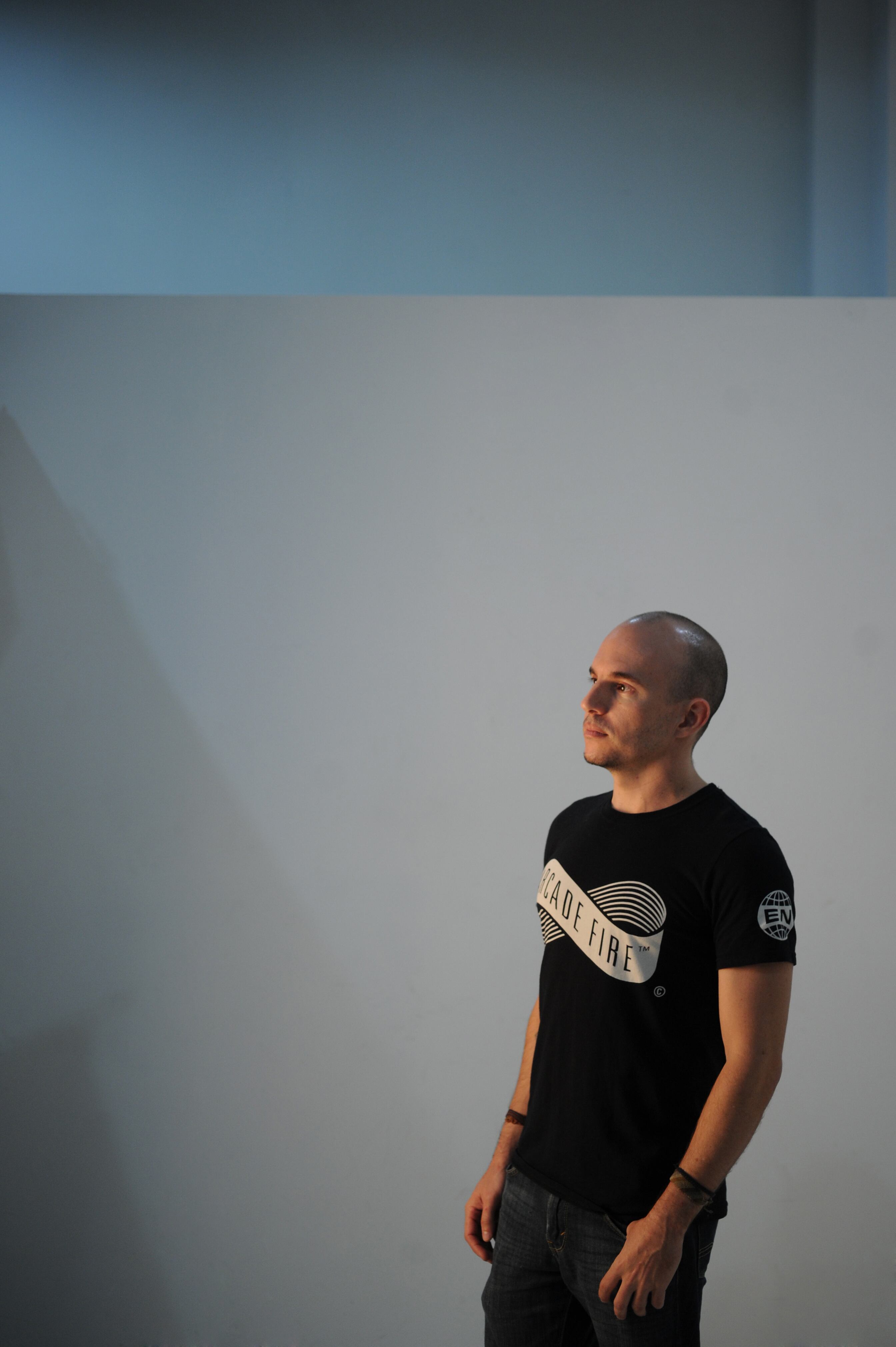 Adrián Pauly entra al encuadre de la foto usando una chema de Arcade Fire.