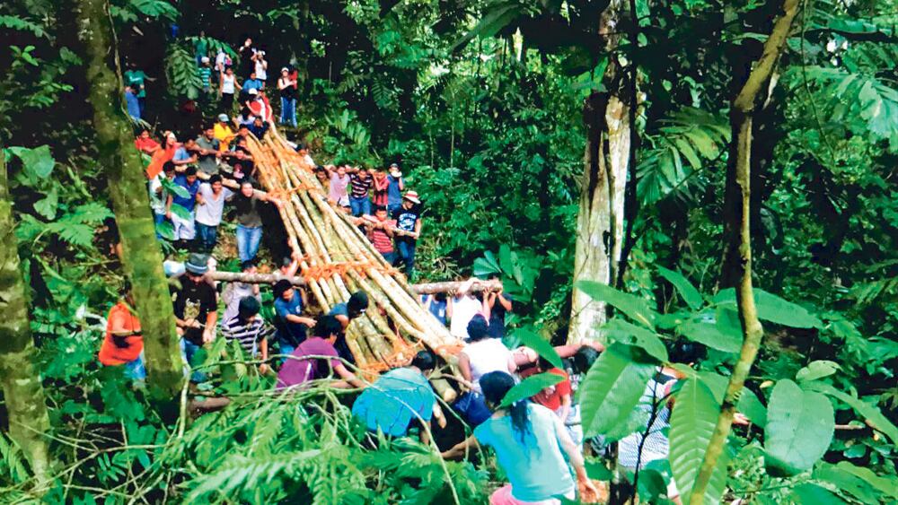 La práctica requiere un esfuerzo para comunicarse entre todos de la mejor manera. Los hombres cargan en sus hombros una cama de troncos que unieron con lianas en forma de tejido, y adelante, una hilera de mujeres, carga una raíz.