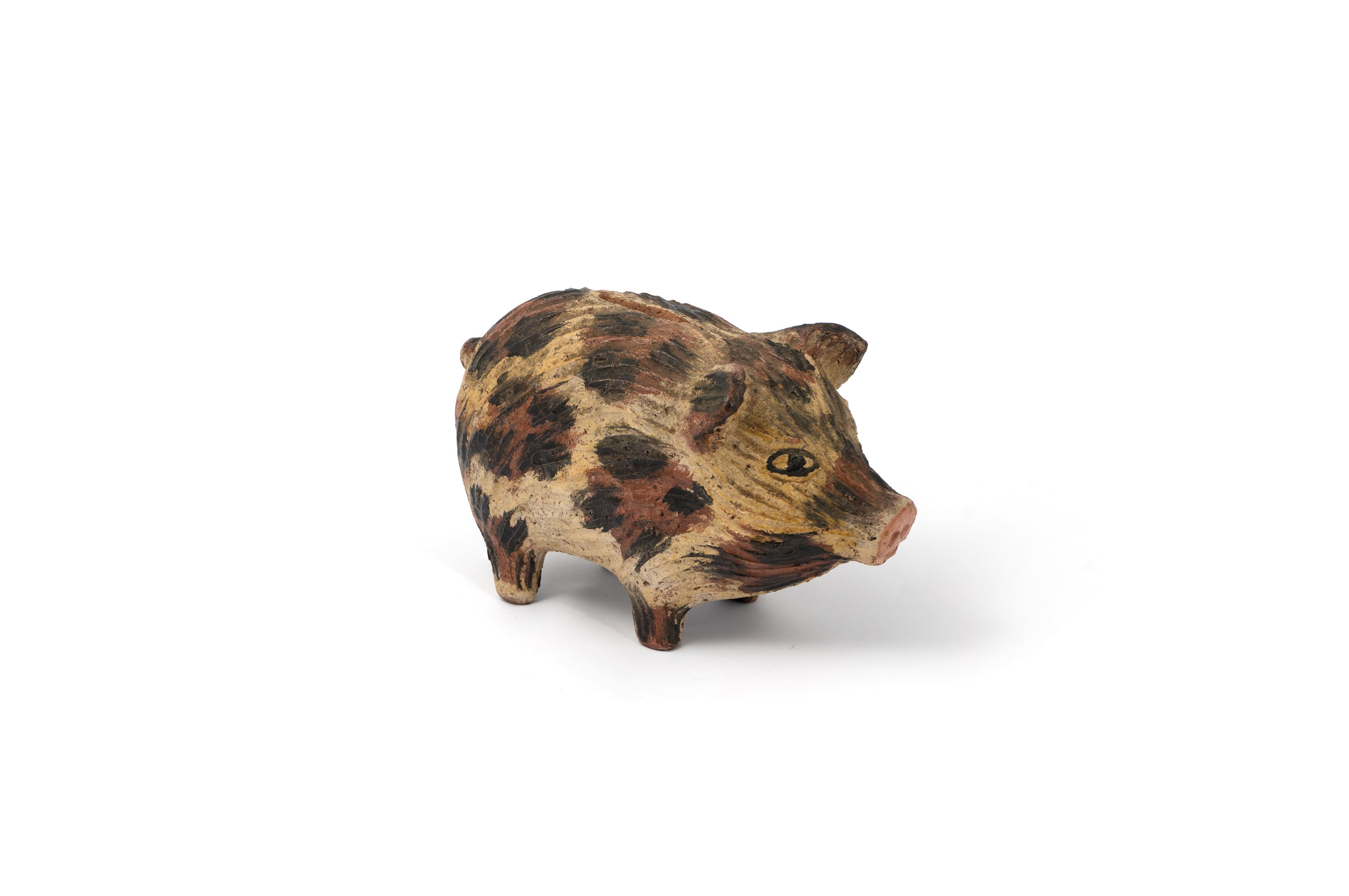 “Una explicación señala que se originaron por una confusión de nombres, ya que durante la Edad Media en Europa del Este se utilizaba un material barato parecido a una arcilla de color anaranjado para fabricar recipientes y guardar el dinero, al cual en inglés se le conocía como pygg, y las vasijas que se fabricaban con él eran conocidas como pygg jars (jarras o tarros pygg, en inglés). La similitud entre las palabras pygg y pig (cerdo en inglés) habría dado lugar a confusiones por lo que, en el siglo XIX, los alfareros ingleses empezarían a producir alcancías en forma de cerdo por esa confusión del idioma”, detalla la propia exposición en el museo josefino.