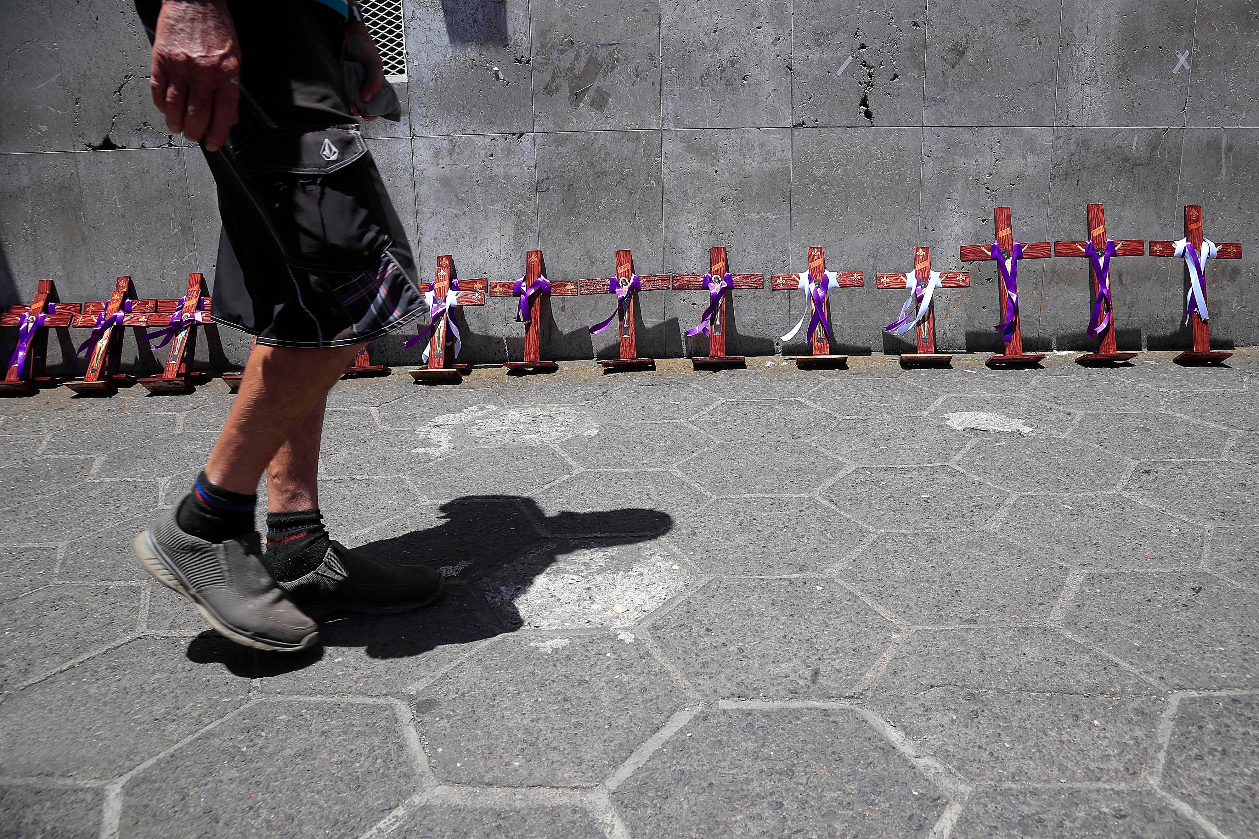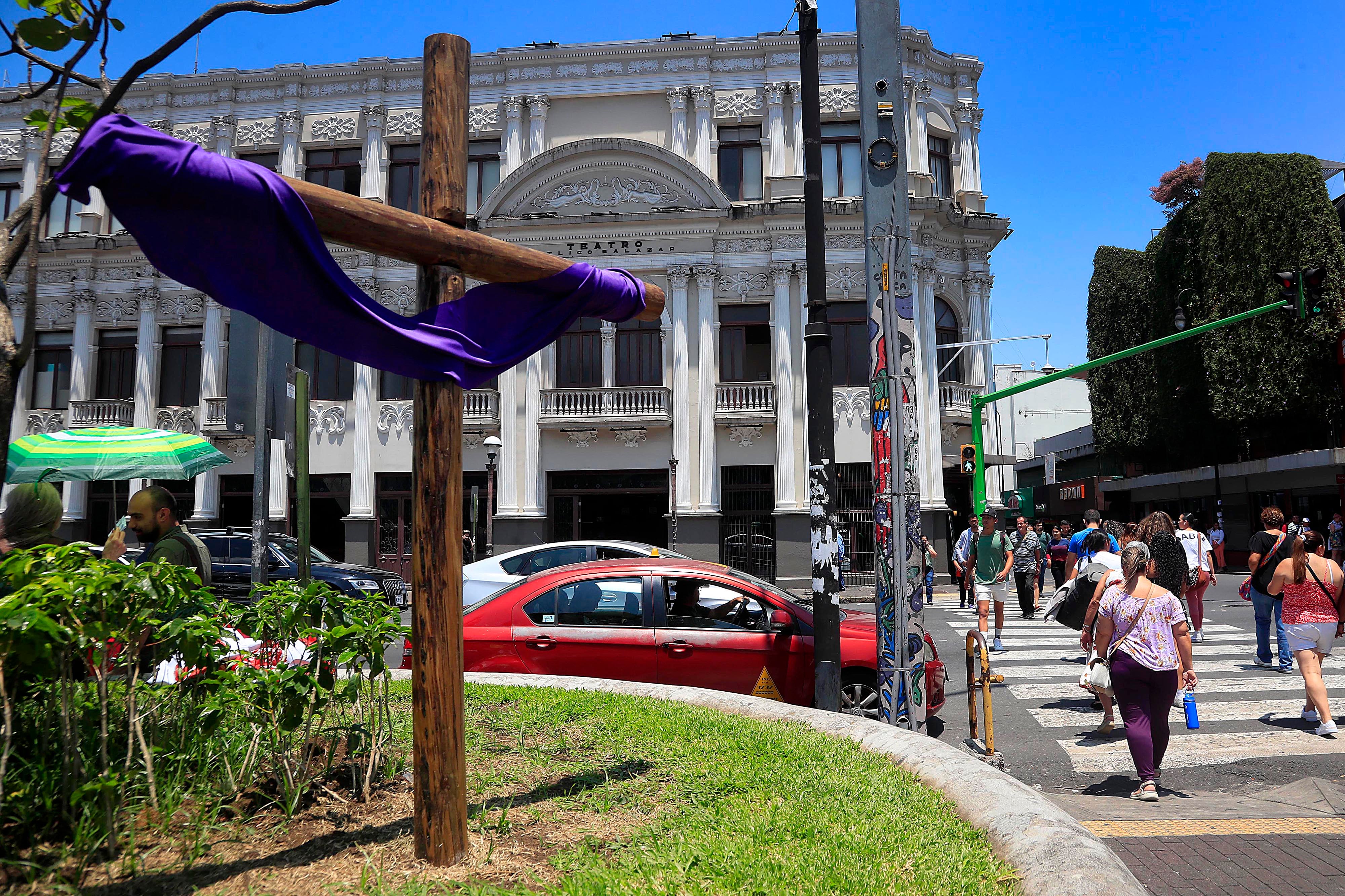 Un kilómetro más hacia el sur, cerca del Mercado Municipal, las personas que caminan por allí los fines de semana también se topan con las pequeñas cruces que vende Édgar Alfonso Rozo. Él las ofrece a ¢2.000, ¢3.000 y ¢4.000.