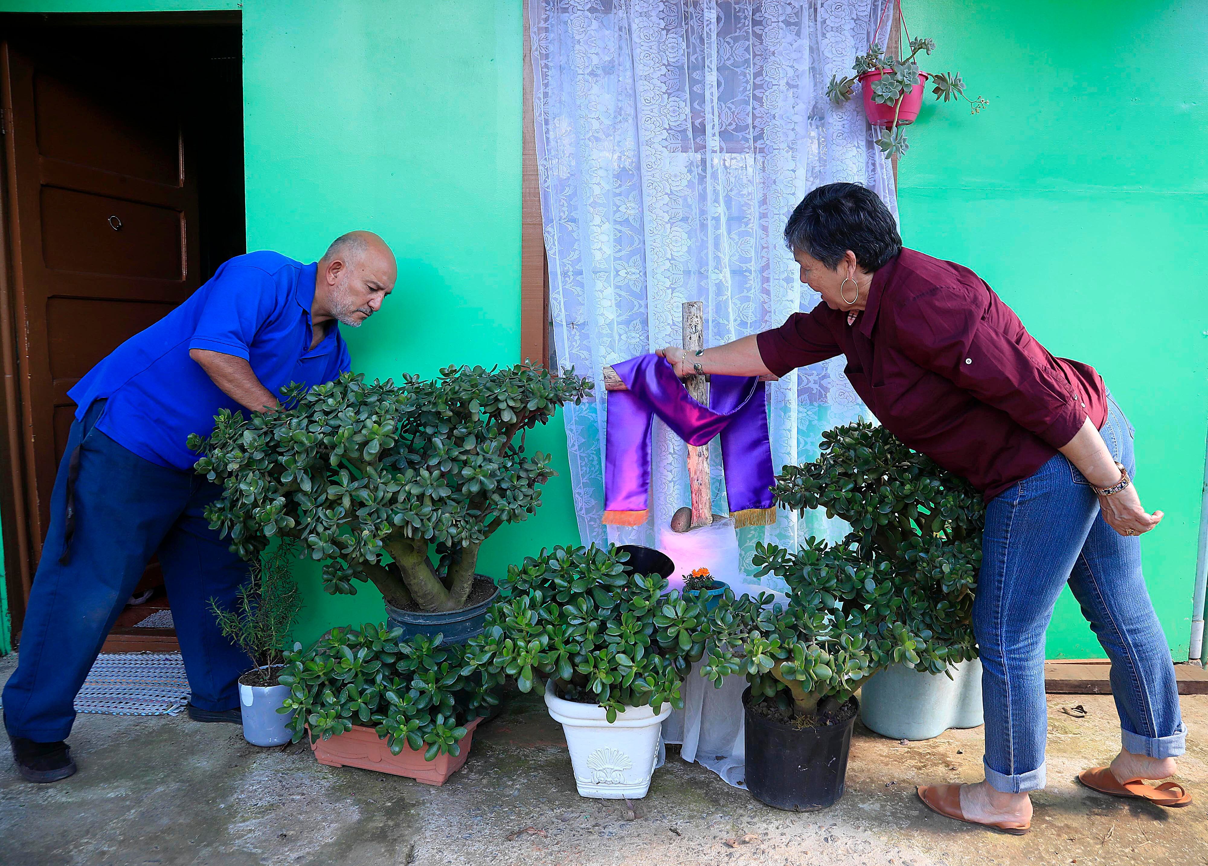 En algunos casos, además, le colocan plantas alrededor. Por ejemplo, Rodolfo Gómez Gúzmán y Yamileth Madrigal la rodean de jades, también conocidas como árbol del tesoro o de la abundancia. Ellos viven en Pueblo Nuevo de Cipreses, en Oreamuno, y desde la carretera se puede apreciar su pequeño altar.