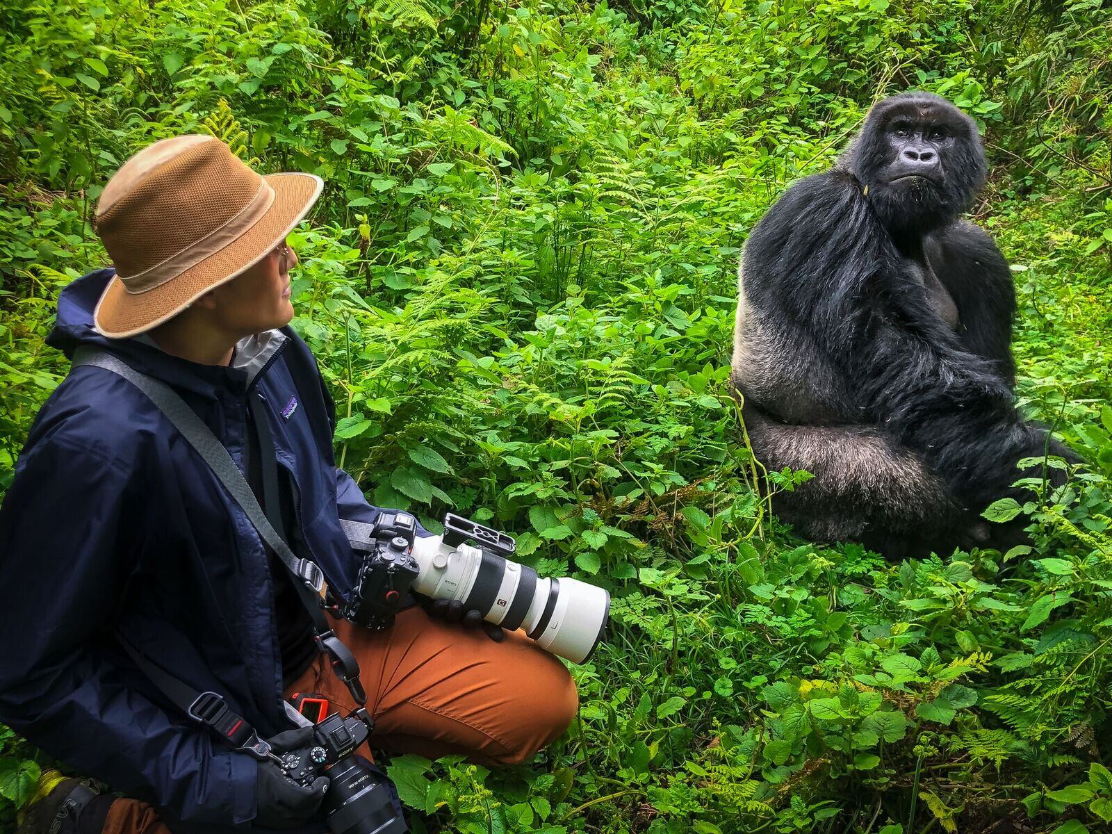 Estando en Ruanda, pudo acceder a dos visitas guiadas en las que solamente pueden participar ocho personas mientras caminan, a veces durante cinco horas, hasta encontrar familias de estos primates. En el camino, él y los otros visitantes fueron acompañados por un guía que carga un rifle para “asustar a los animales” en caso de que se pongan agresivos; en los últimos tiempos no hay registro de ello, pues las robustas criaturas se han habituado a la visita de seres humanos.
