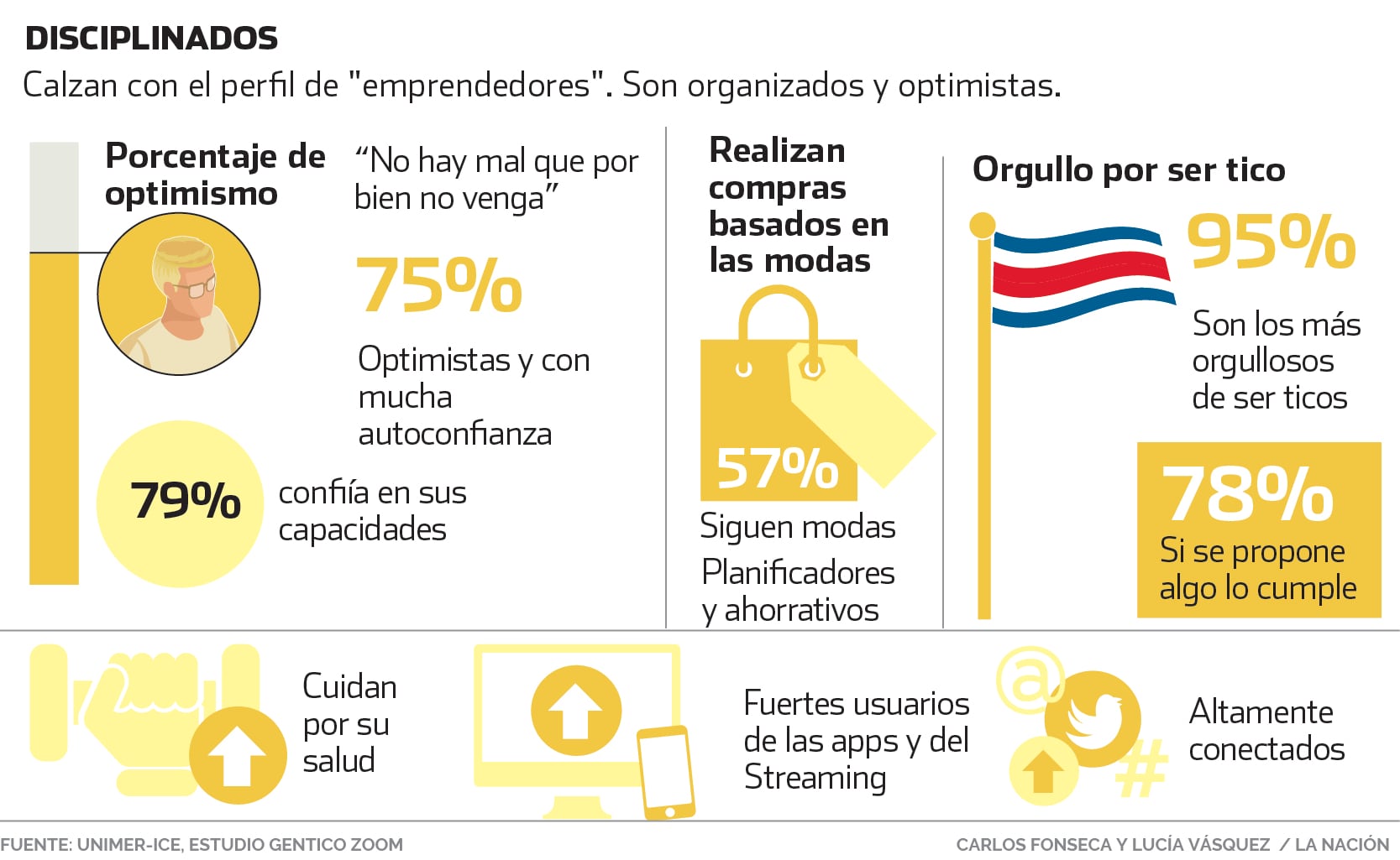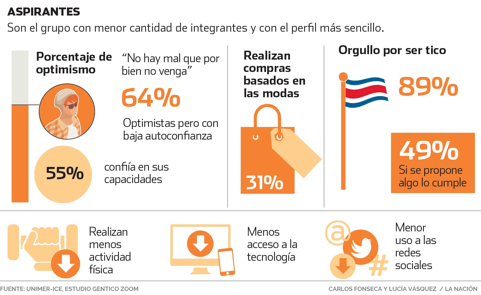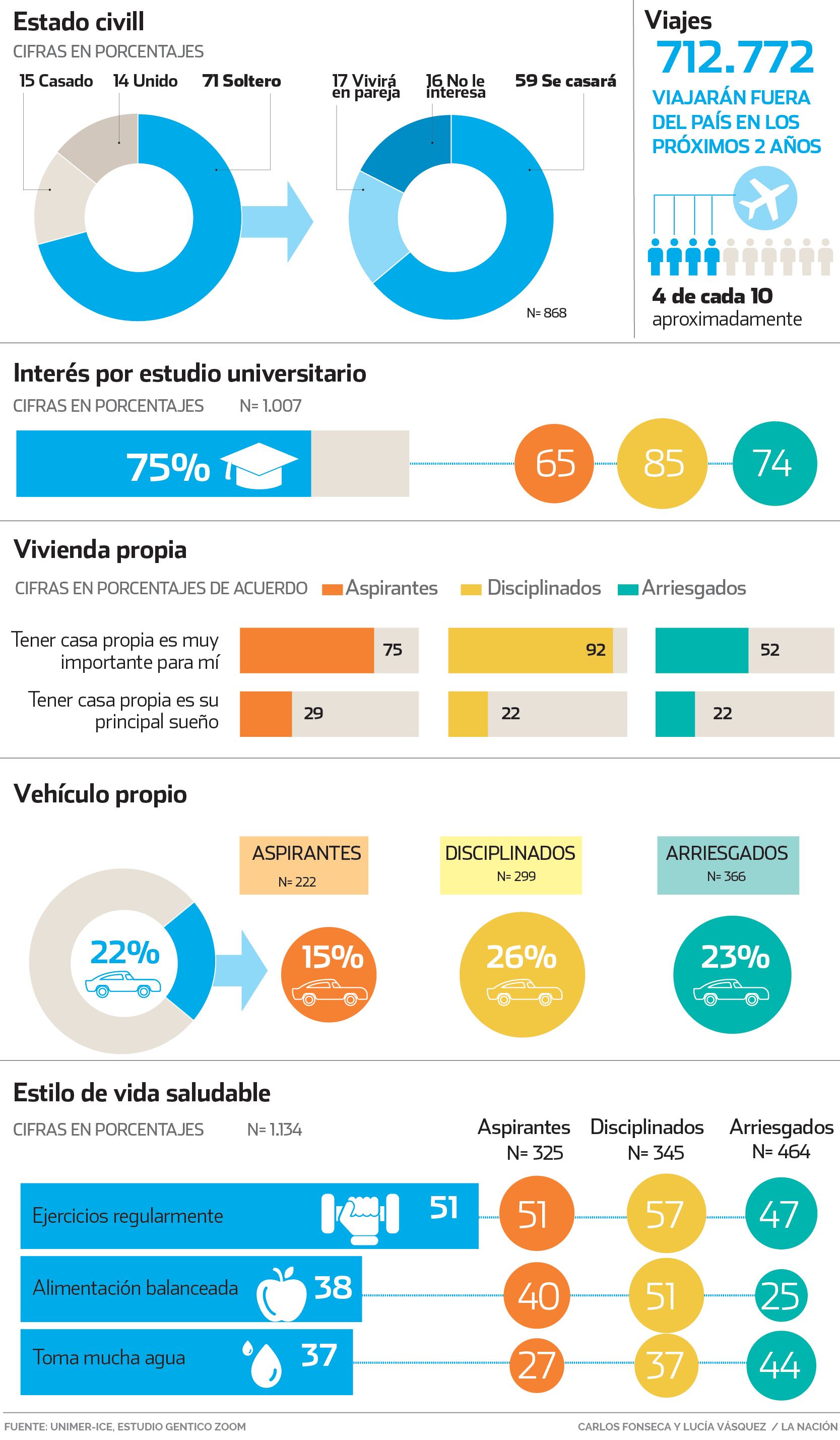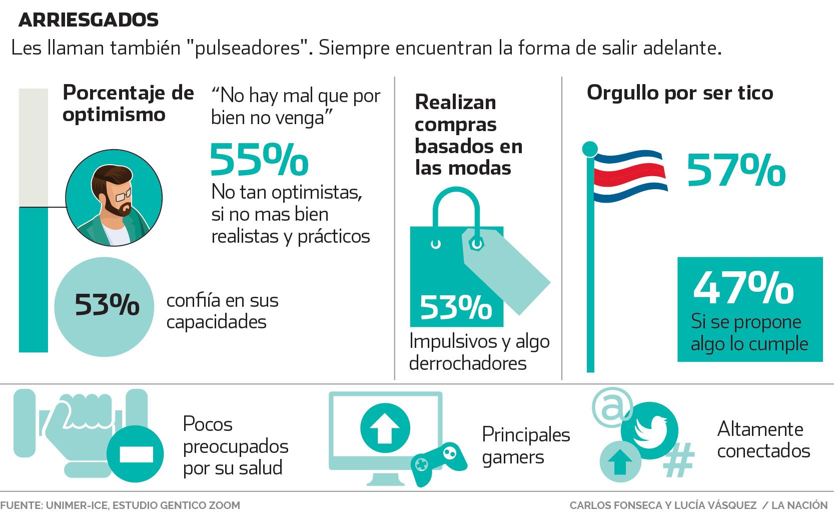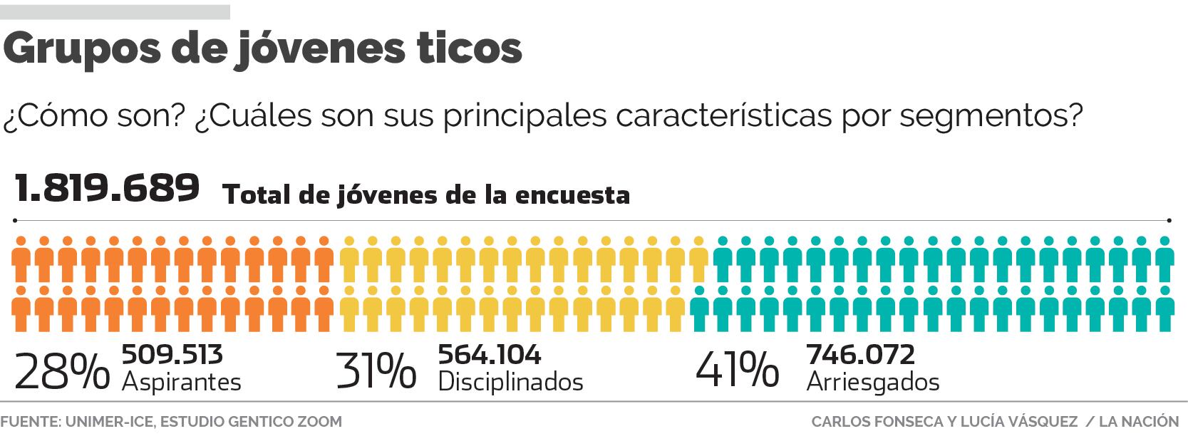 “En nuestro país existen tres grupos de jóvenes definidos a partir de las variables que analizamos, que se dividen por sus características actitudinales”, explicó Katherinne Serrano, coordinadora del estudio Gentico Zoom. “Nosotros les llamamos a un primer grupo ‘aspirantes’, que representan el 28% de nuestra población juvenil. Es decir, cerca de medio millón de costarricenses. Al segundo grupo le llamamos ‘disciplinados’, con un 31% de la cantidad total de jóvenes. Al tercer grupo le llamamos ‘arriesgados’, con cerca del 41%, que representan unos 700.000 jóvenes”.