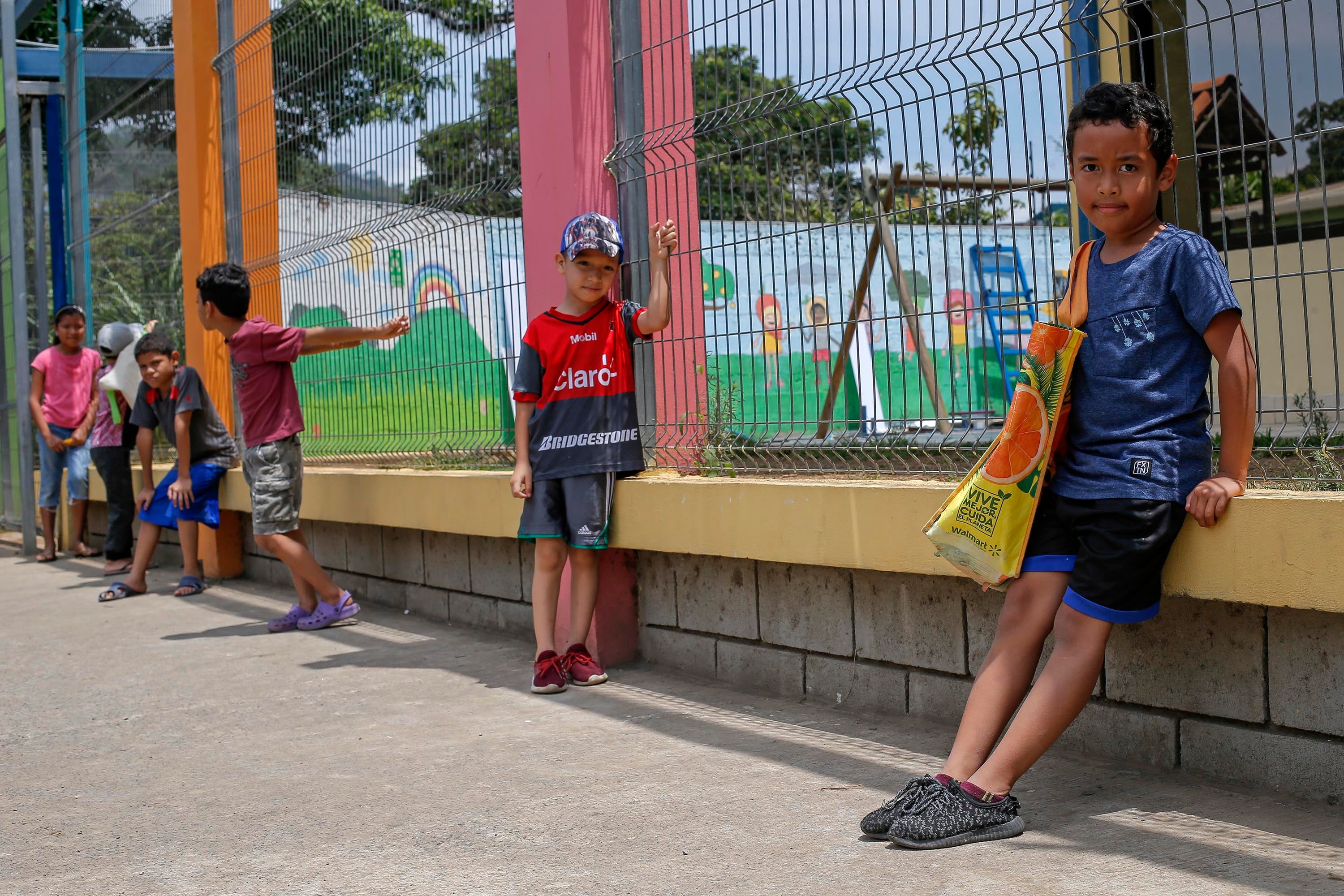 En otra mesa está Justin Bermúdez, el hijo mayor de Cinthya, que hace poco terminó de comer. Él mientras convive con otros niños que escampan la lluvia; tiene 10 años y la costumbre de asistir al comedor los cinco días que abre. En su mente infantil no tiene noción de los estragos que la covid-19 causa en el mundo. Para él su salida a almorzar es un momento especial porque aparte de estar fuera de casa, puede ir a probar una rica comida y a sorprenderse con la merienda que le dan para llevar.