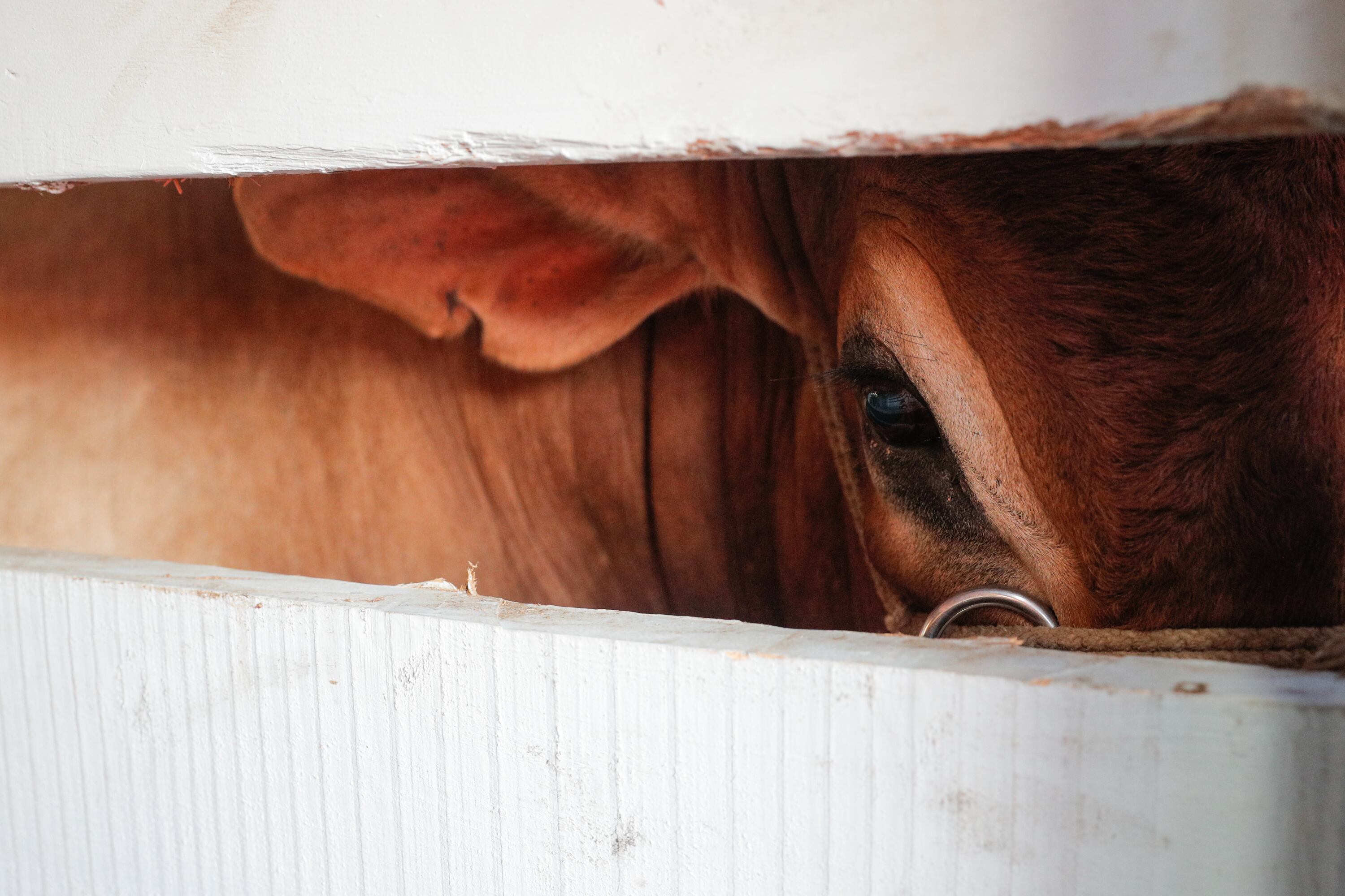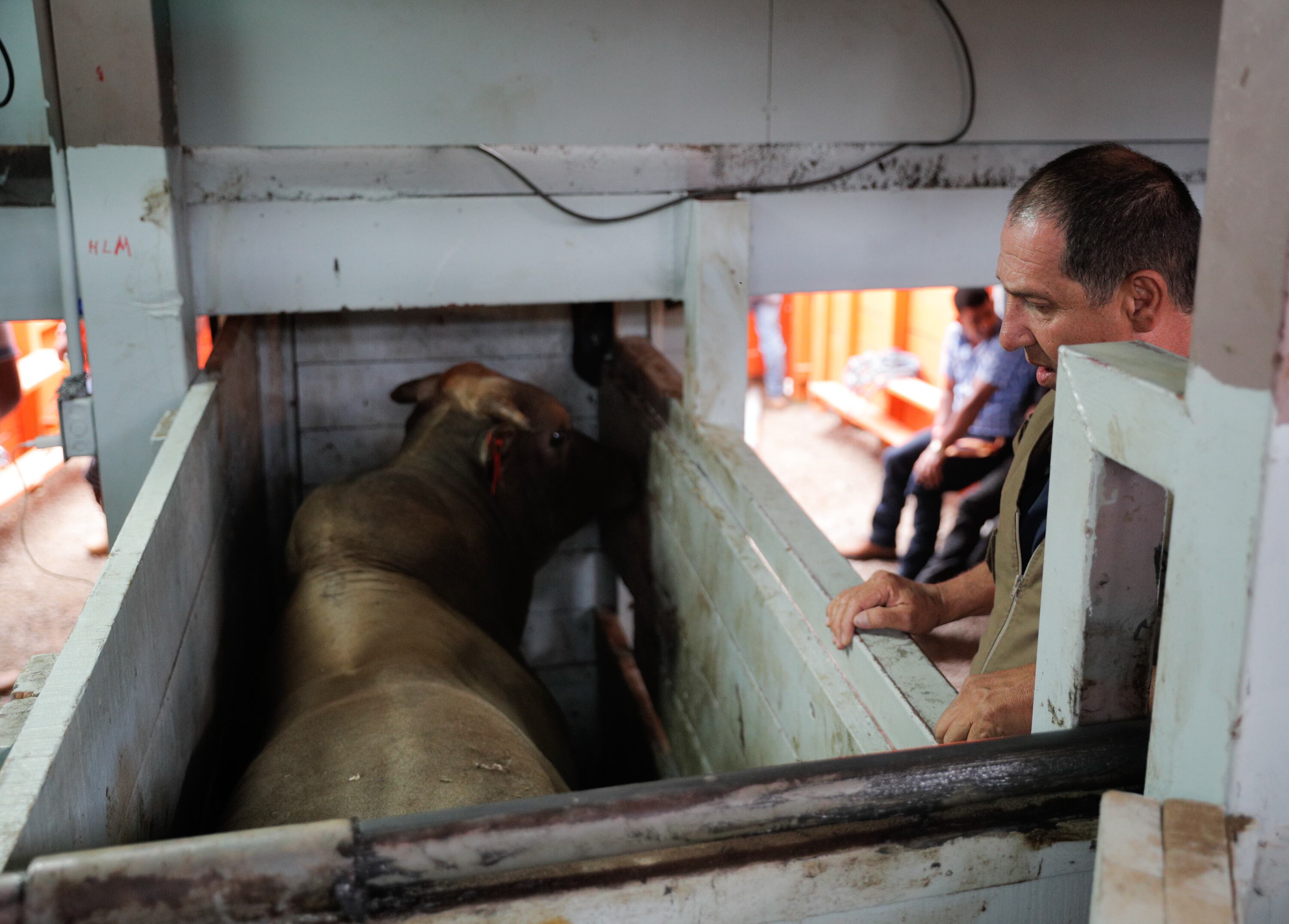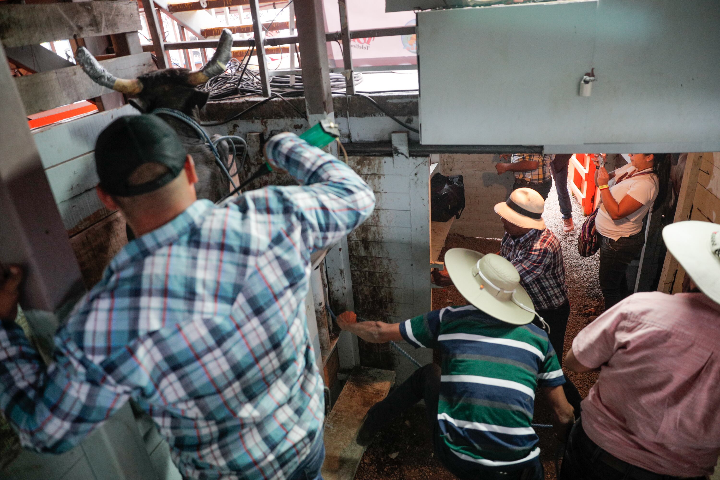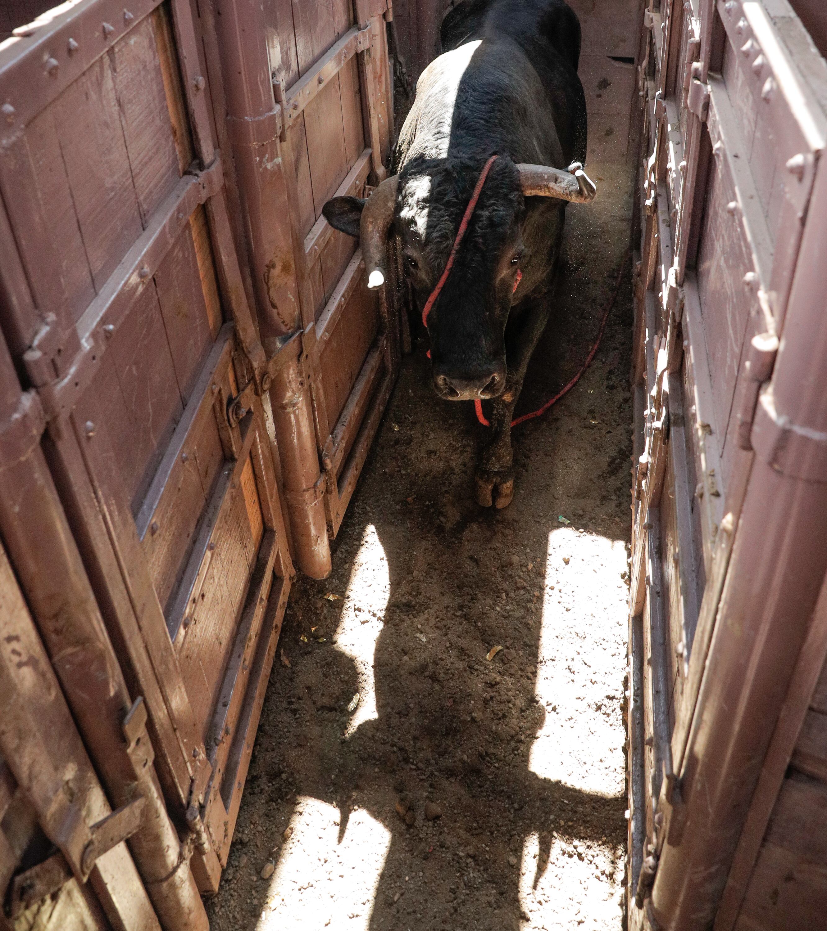 Uno a uno los toros se arrean desde el camión hacia un lugar conocido como “esqueleto de pescado” por la forma de su estructura. El esqueleto de pescado tiene una protección especial para que el sol no afecte a los toros y está formado por 24 cubículos llamados apartos, uno para cada toro. “Están construidos para que alberguen un toro de aproximadamente 800 kilos, son amplios para la comodidad del animal y no permiten que este dé vuelta para que no se lastimen”, explicó Carrillo.