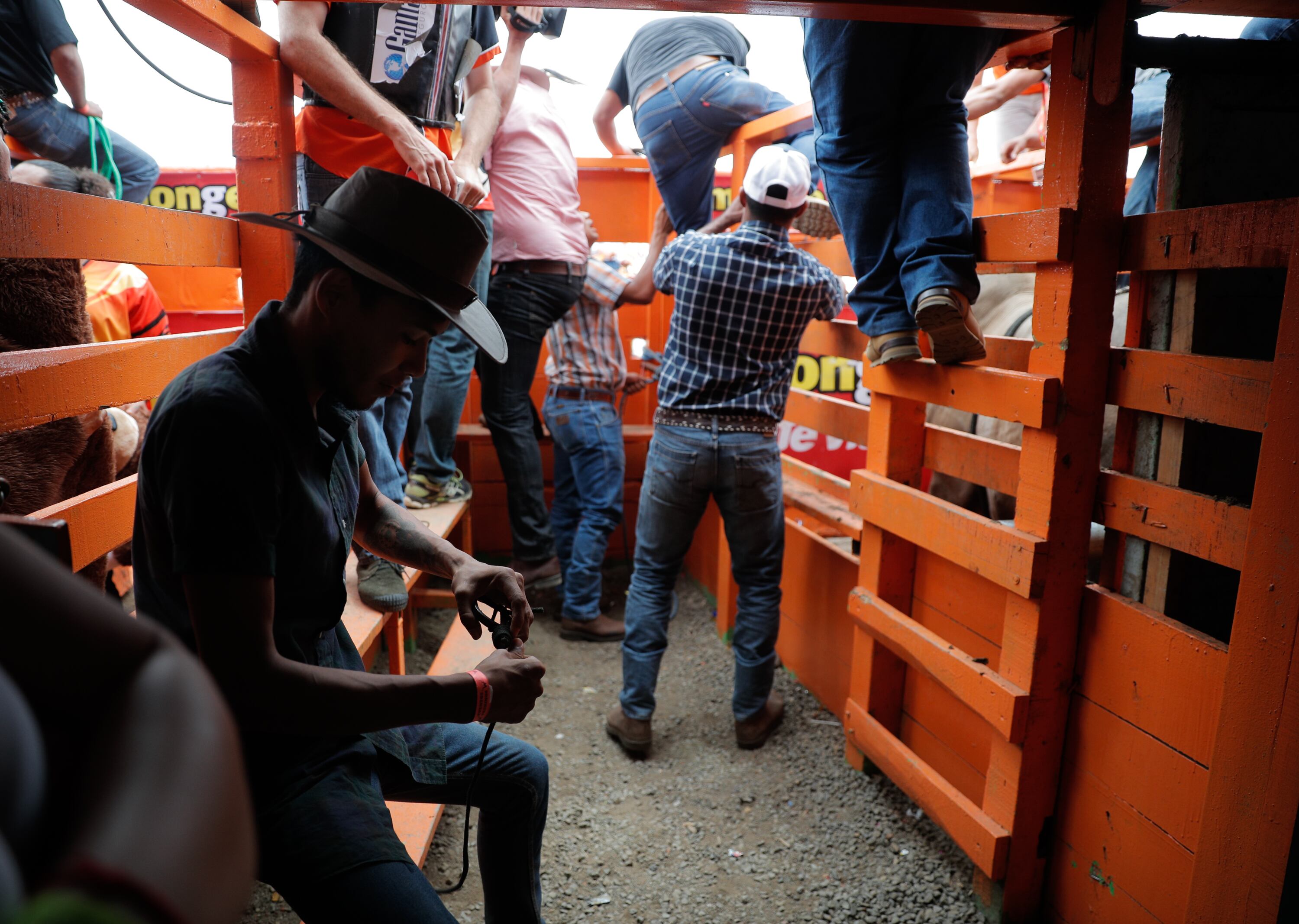 De manera sincronizada los expertos alistan el nuevo toro para el ruedo, o a cacho, como también se les llama en la jerga. Doce manos amarran, zocan el pretal, ponen el falso, sostienen, nalguean con emoción a la bestia y las puertas se abren para liberar cientos de kilos de bravura.