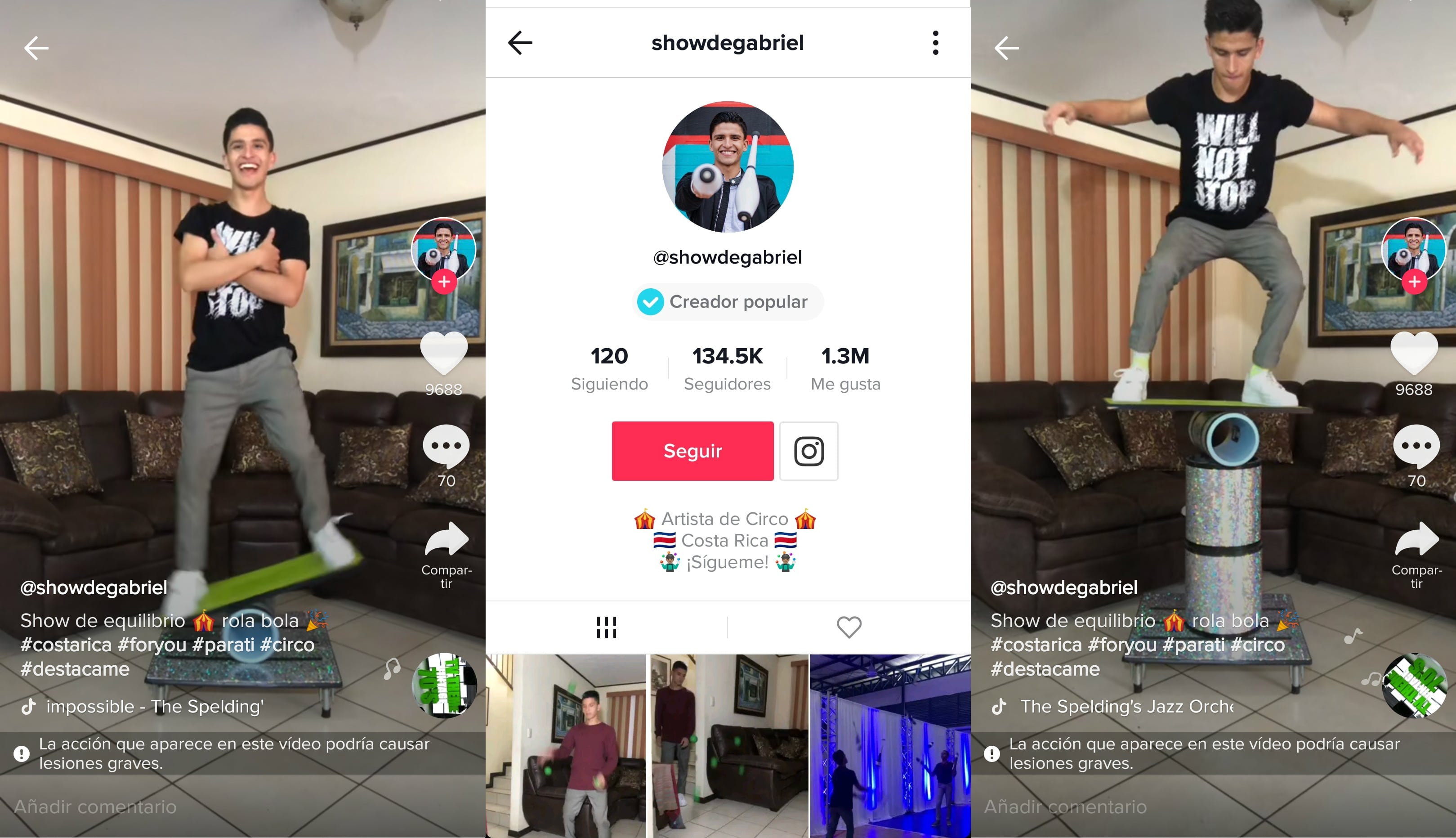 Gabriel empezó a grabar videos haciendo malabares y rutinas balanceándose en una tabla en la sala de su casa en Tres Ríos y ahora tiene 134.500 seguidores en TikTok y todos sus videos suman 1.3 millones de likes. Él asegura que TikTok es la plataforma digital con más alcance de todas las que ha usado.