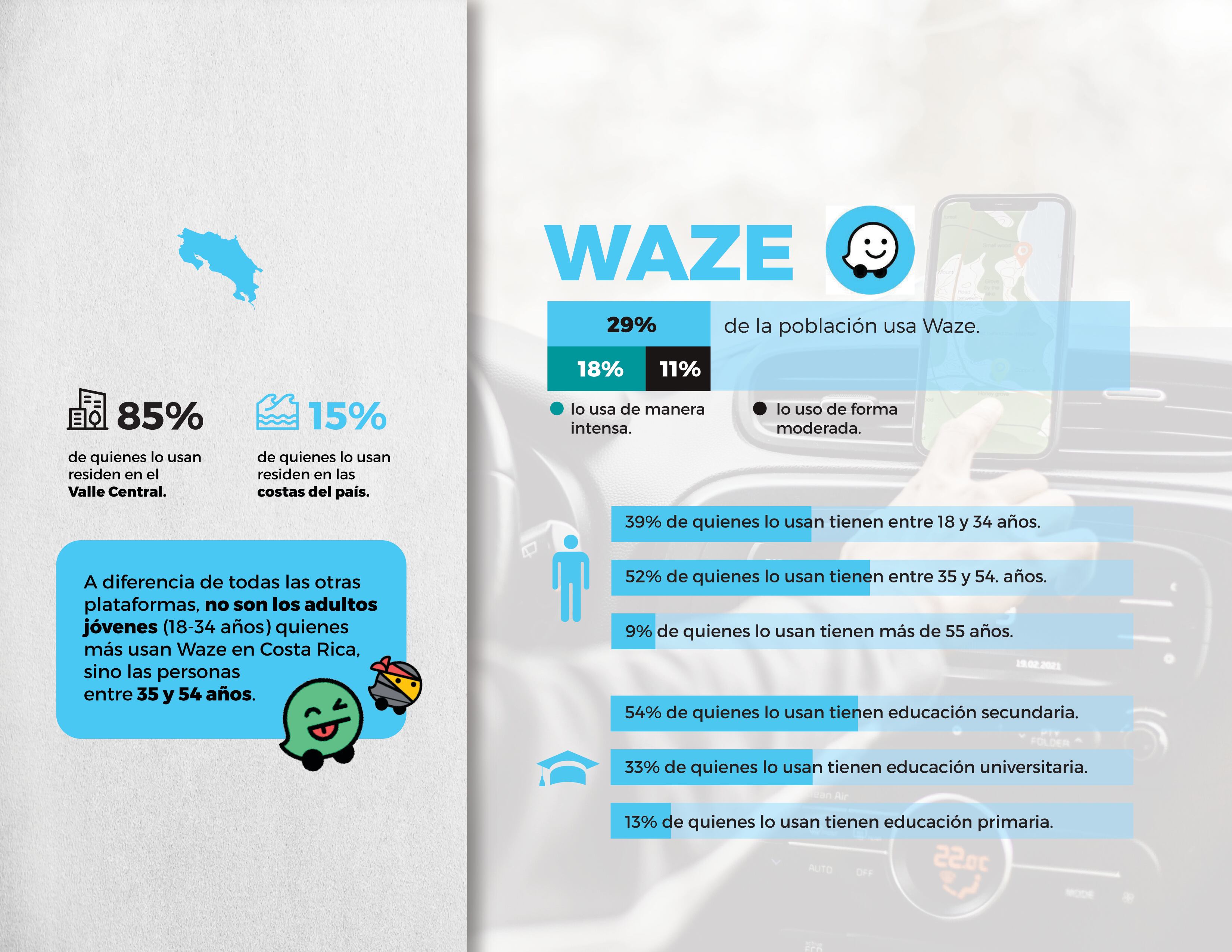 Waze es utilizado por un 29% de ticos encuestados, mientras que el segundo servicio en figurar en su categoría es la plataforma de transporte privado Uber, con un 21%.