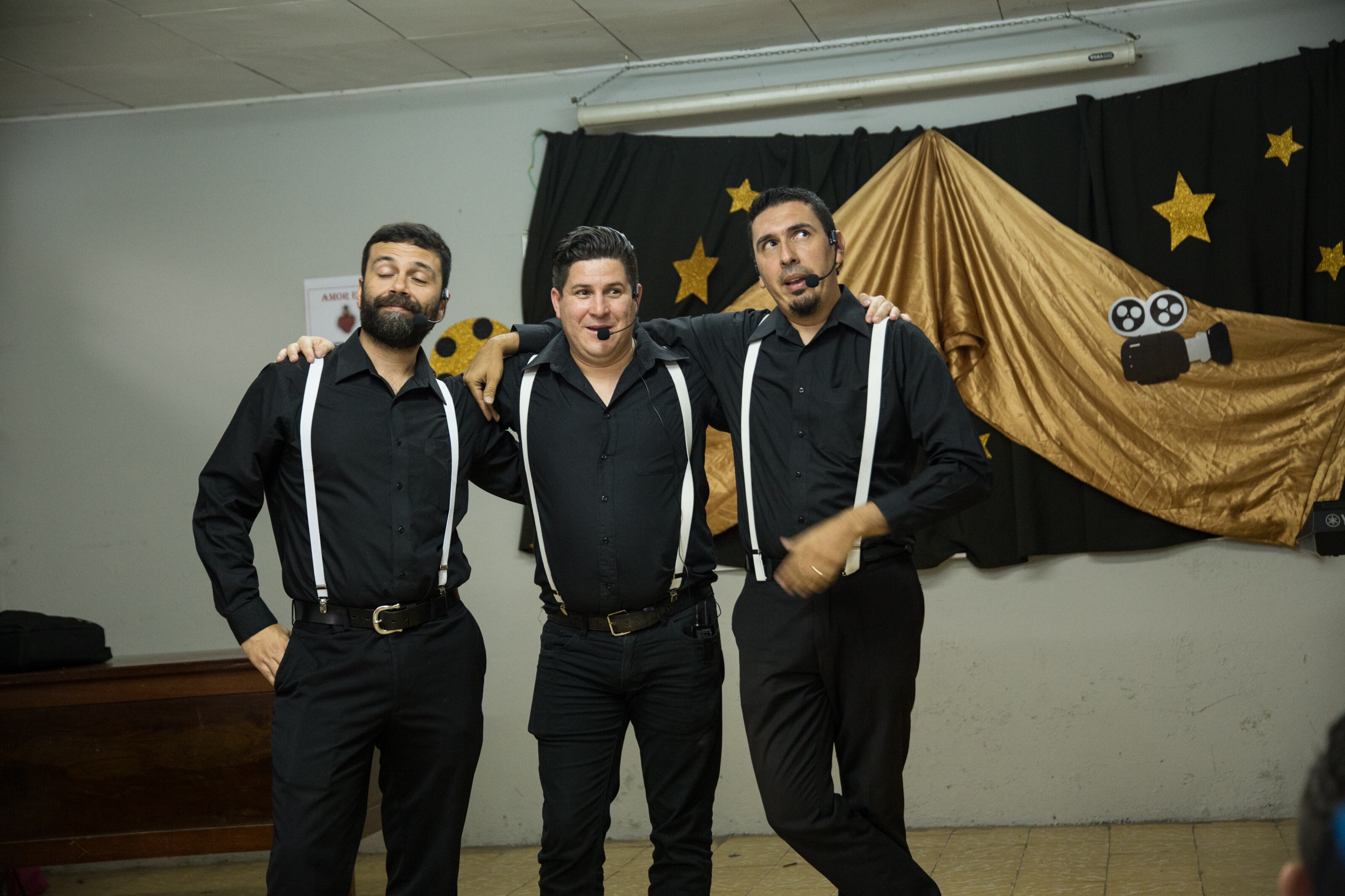 Tan solo una hora después, tres hombre afinaban los últimos detalles para iniciar con su espectáculo. Completamente vestidos de negro (a excepción de sus tirantes color blanco), estos caballeros anunciaban acompañados de su guitarras, armónica y teclado que era el momento de dar paso a su “humor reflexivo”. En la hora que duró su show, hicieron que el público se levantara de sus asistentes para bailar, cantar y hasta actuar.