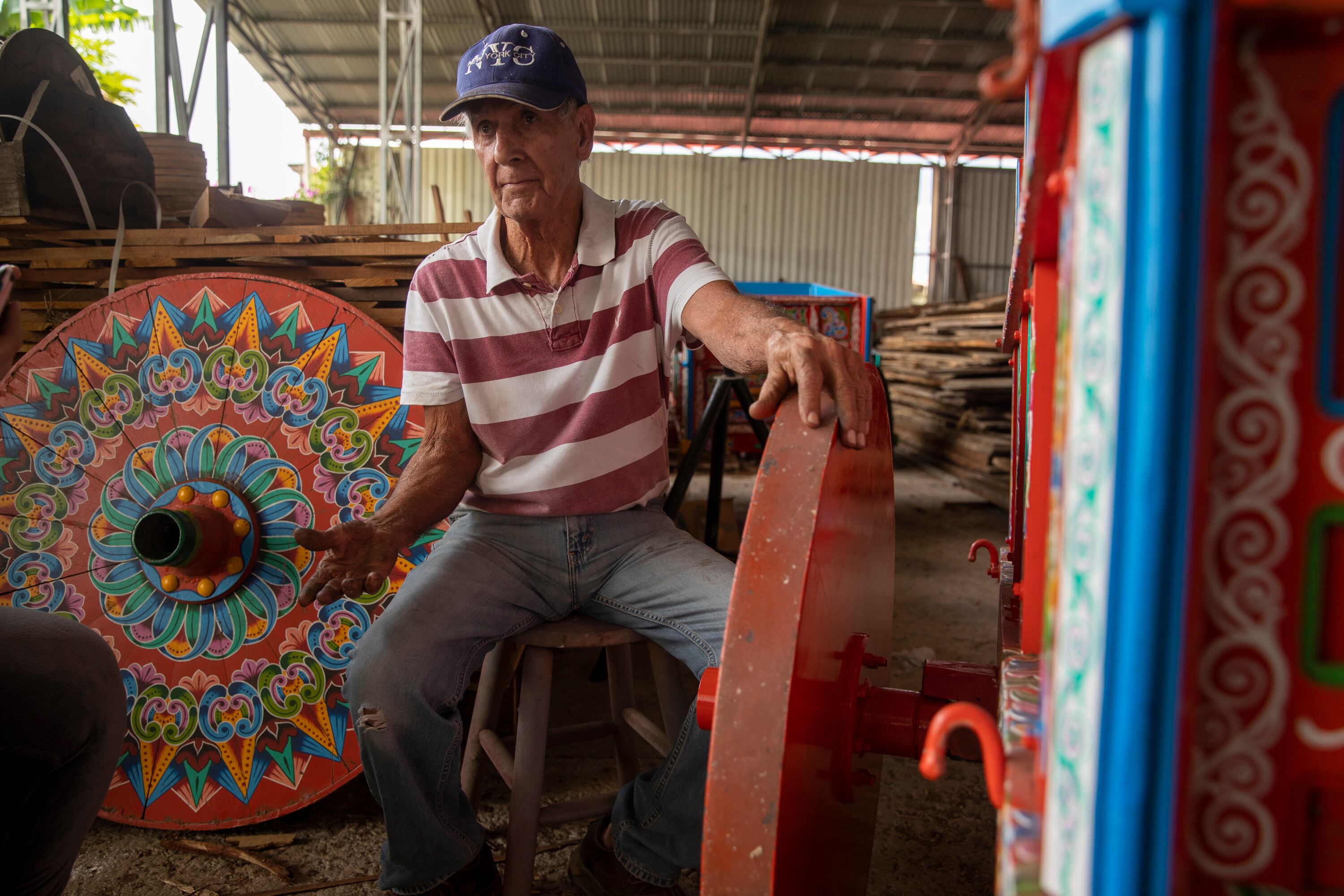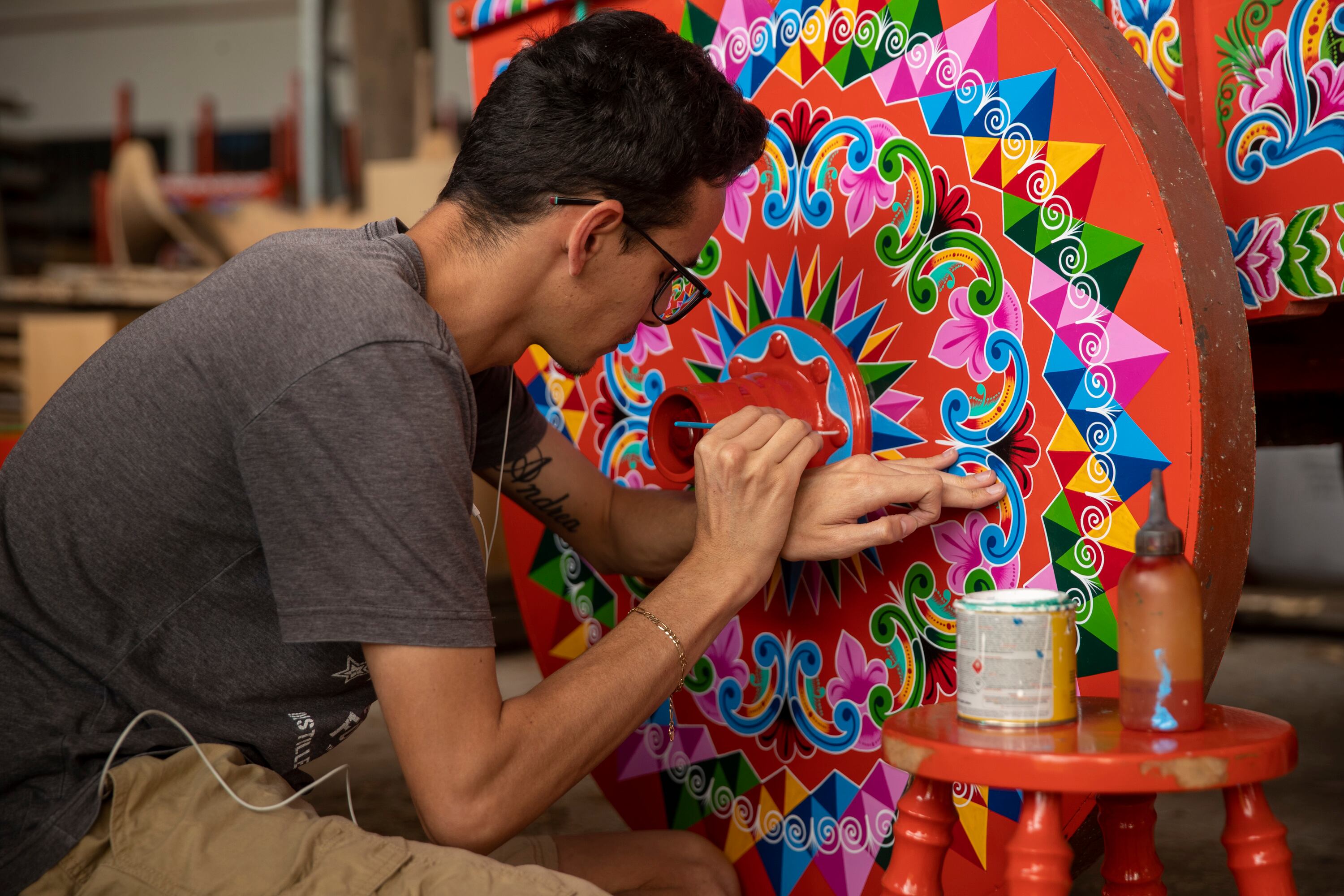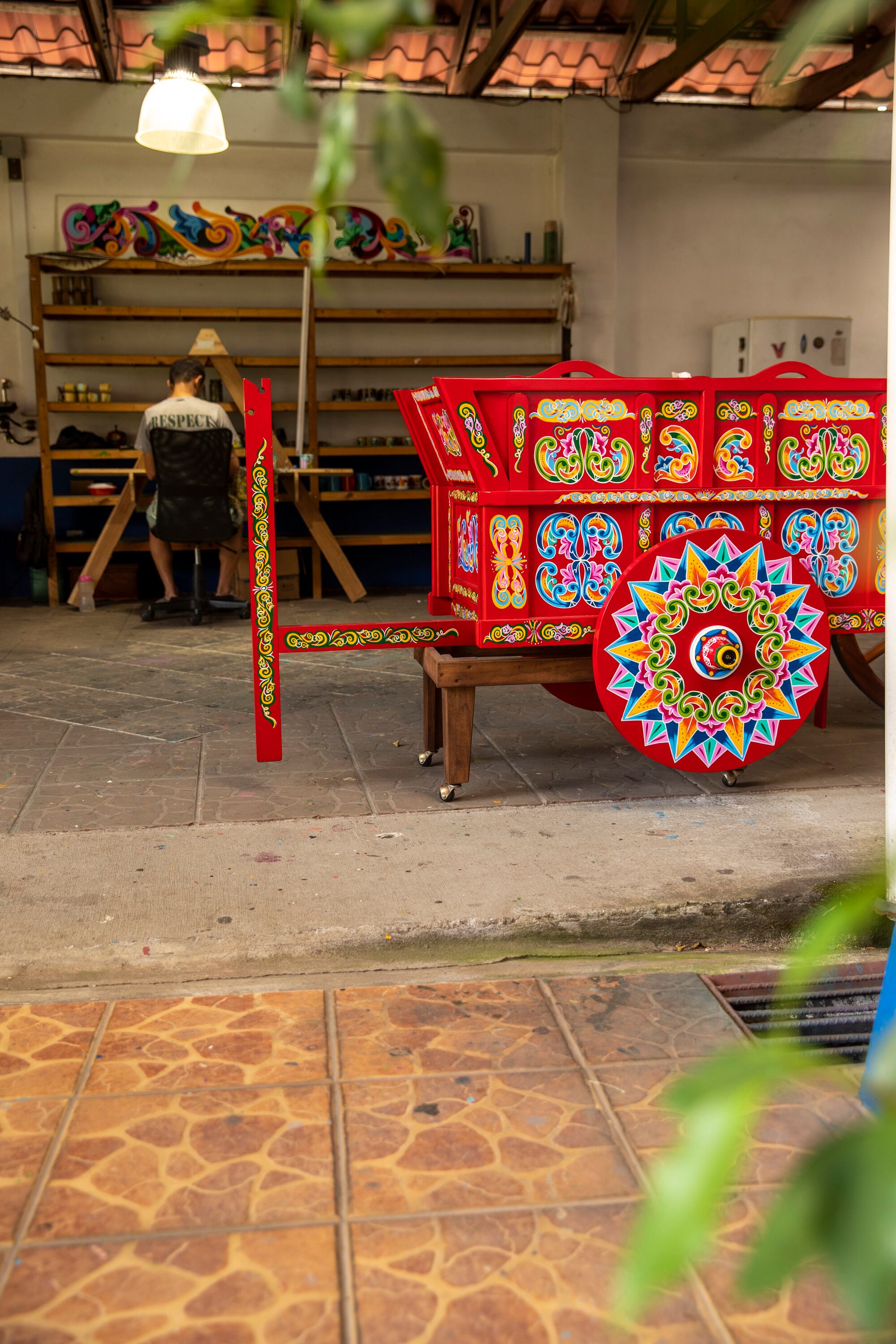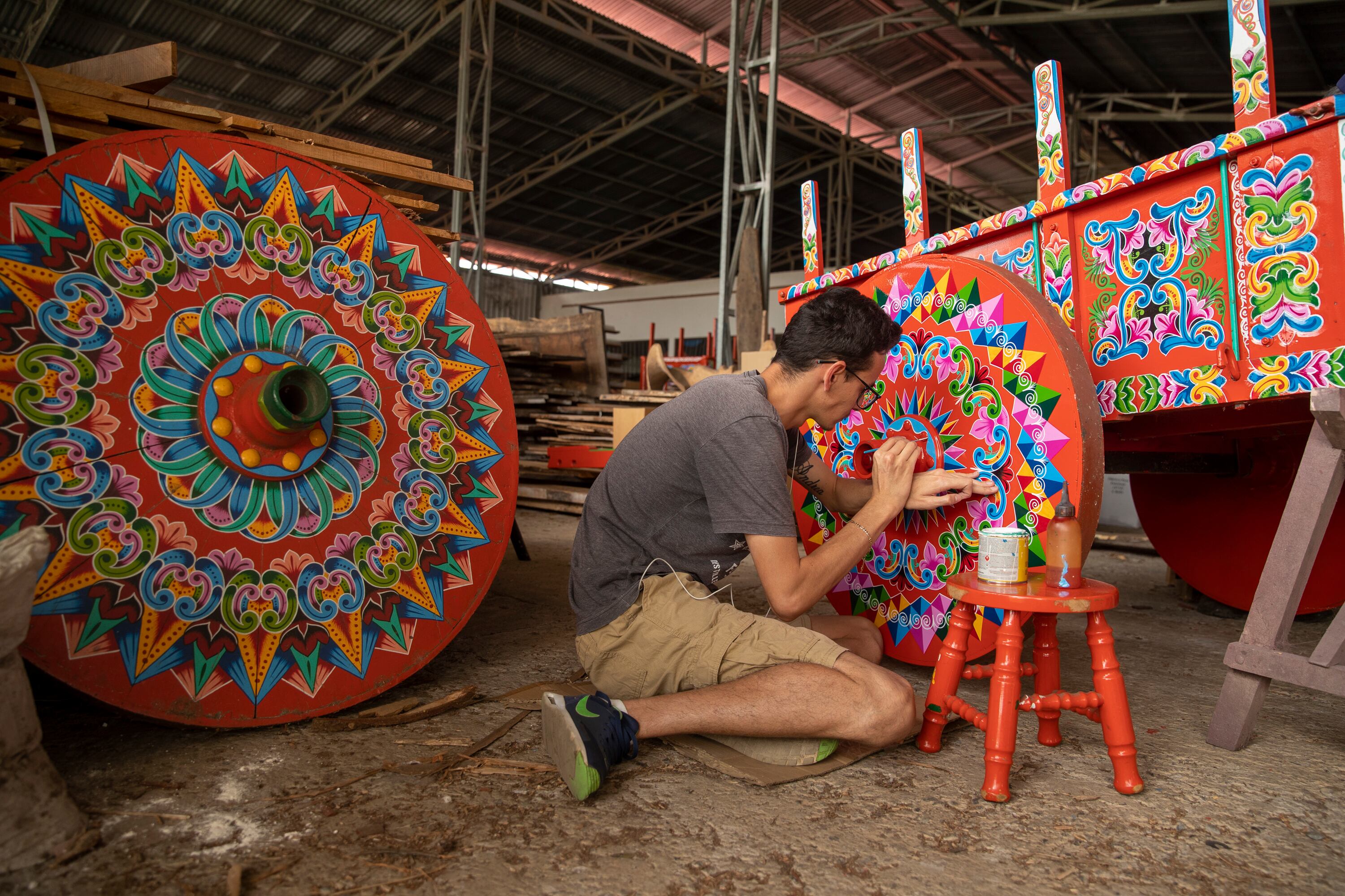 Encontramos a Kevin Madrigal, un sarchiseño de 25 años, concentrado con un delgado pincel cargado de pintura blanca. Él está haciendo los bordes de unos ornamentos de una carreta muy colorida. Contó que se enamoró de la pintura de carretas desde los 12 años, cuando veía a su tío trabajando en esto. Fue con él que empezó a aprender.