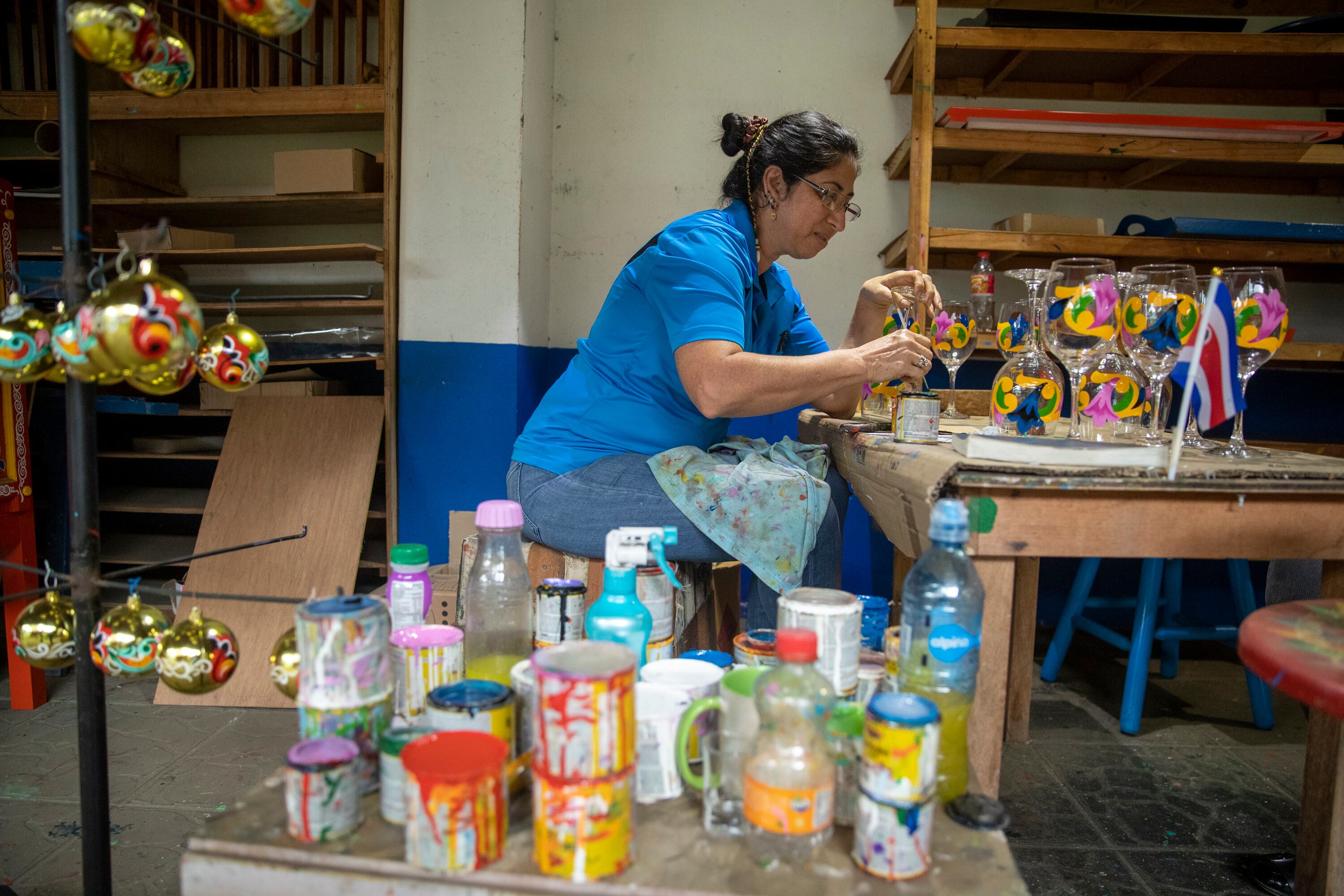 Elizabeth Jiménez, de 53 años, también es pintora en el taller Alfaro desde hace unos seis años. Cuenta que cuando estudiaba en el colegio técnico de Sarchí terminó en la especialidad de pintura de carretas porque el director, en aquel momento, le dijo que metales –otra especialidad– no era para mujeres.