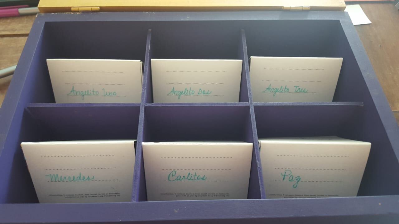 Entonces, antes de que Isabella llegara a sus vidas, Marcela hizo unas cajitas con los nombres de cada uno. Y también unas mandalas. Simbólicamente, para ella, ellos serán los guardianes de Isabella, su hermanita menor.