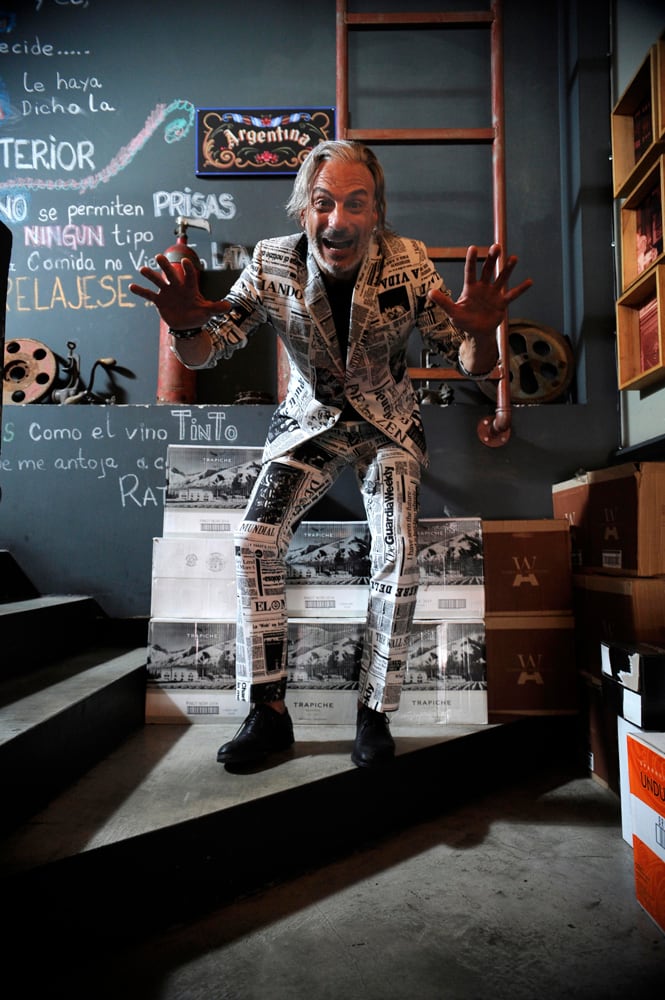 La primera vez que lo veo, viste un traje entero rojo con un estampado de cómics de Marvel. Baila, canta, interactúa con sus clientes y les da indicaciones a sus trabajadores mientras los deliciosos cortes de carne hacen fiesta en nuestros paladares. Fito Paez, Gustavo Cerati, Vicentico y otros de sus compatriotas acompañan la cena. El día de nuestra entrevista, su elección de vestuario es otra: un traje estampado de periódicos.