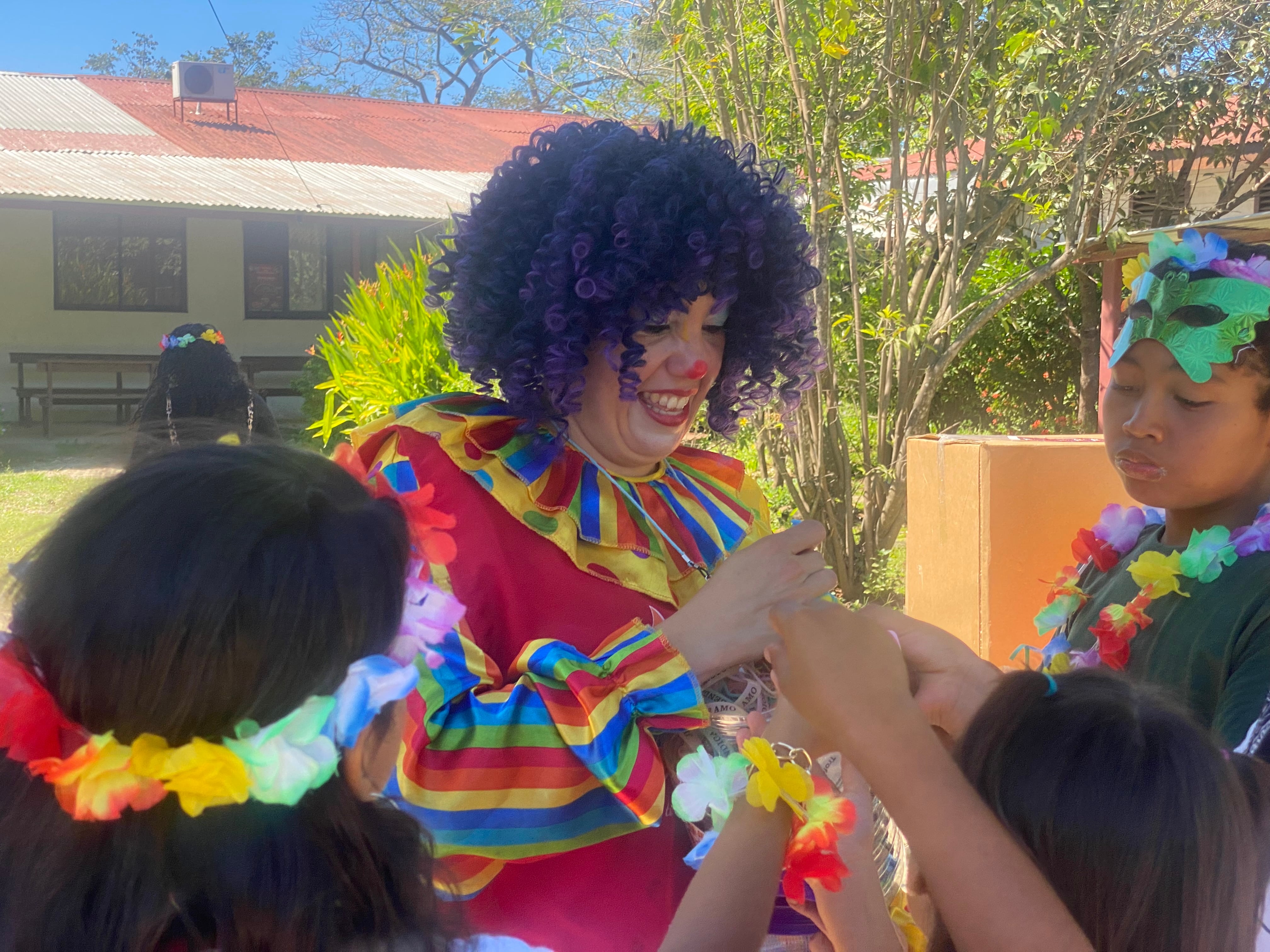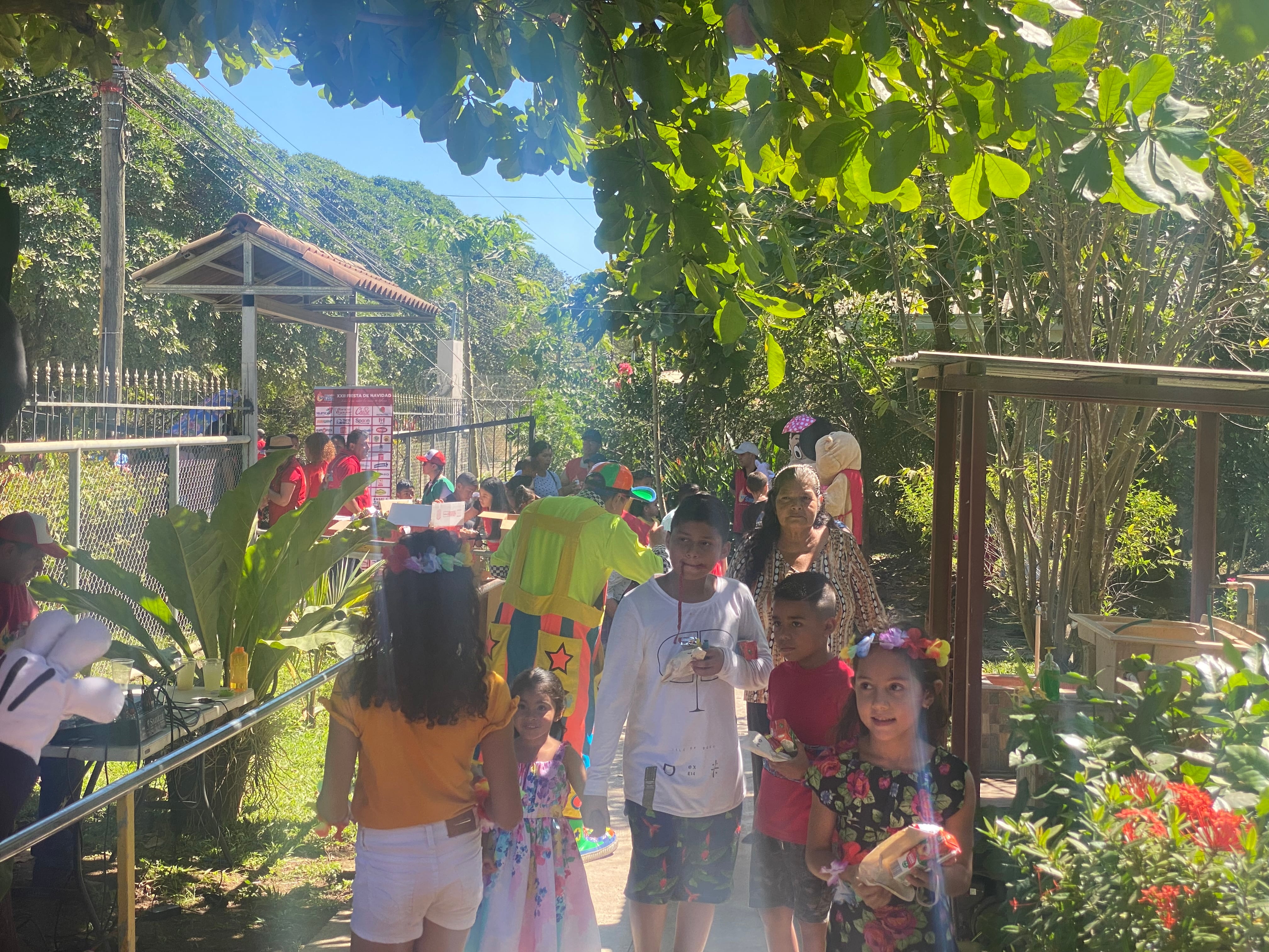 Cada vez llegaban corriendo más niños, y entre ellos, algunos perritos flacos y renqueando. Así se armó una pequeña fiesta improvisada. El payaso Chilvalín, que es protagonizado por Roy Sánchez, un criminólogo de 46 años con desgaste de cadera y quien literalmente soporta el dolor para ofrecer alegría a la niñez, se puso a jugar con los chiquitos que aguardaban esperanzados. Luego se formaron filas y a cada uno se le entregó lo dispuesto.