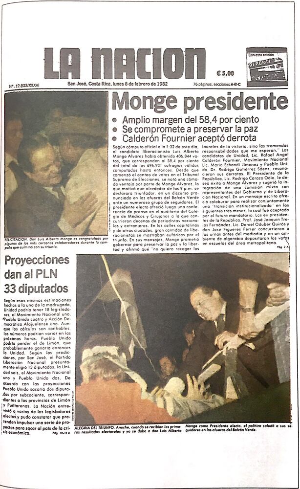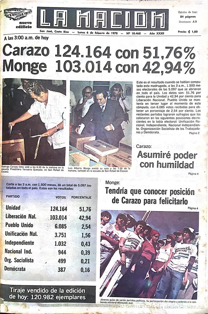 También hablan de cómo el dólar se disparó y la inflación se fue por las nubes. Los costarricenses que compraron La Nación para leer sobre el triunfo de Carazo pagaron ¢1. Cuatro años después, para informarse sobre la llegada de Luis Alberto Monge, debieron desembolsar ¢5.