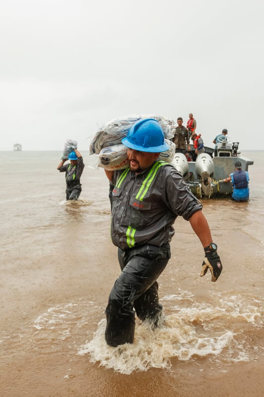 Contra las olas, los cascos azules acuden a recibir a la Megaptera. La lancha, bautizada con el nombre científico de la ballena jorobada, reacciona chúcara y amenaza con bruscos movimientos. En total descargarán 1.400 sacos de cemento de 25 kilos cada uno, varilla, tubería, estañones cargados con diésel, cilindros con gas...