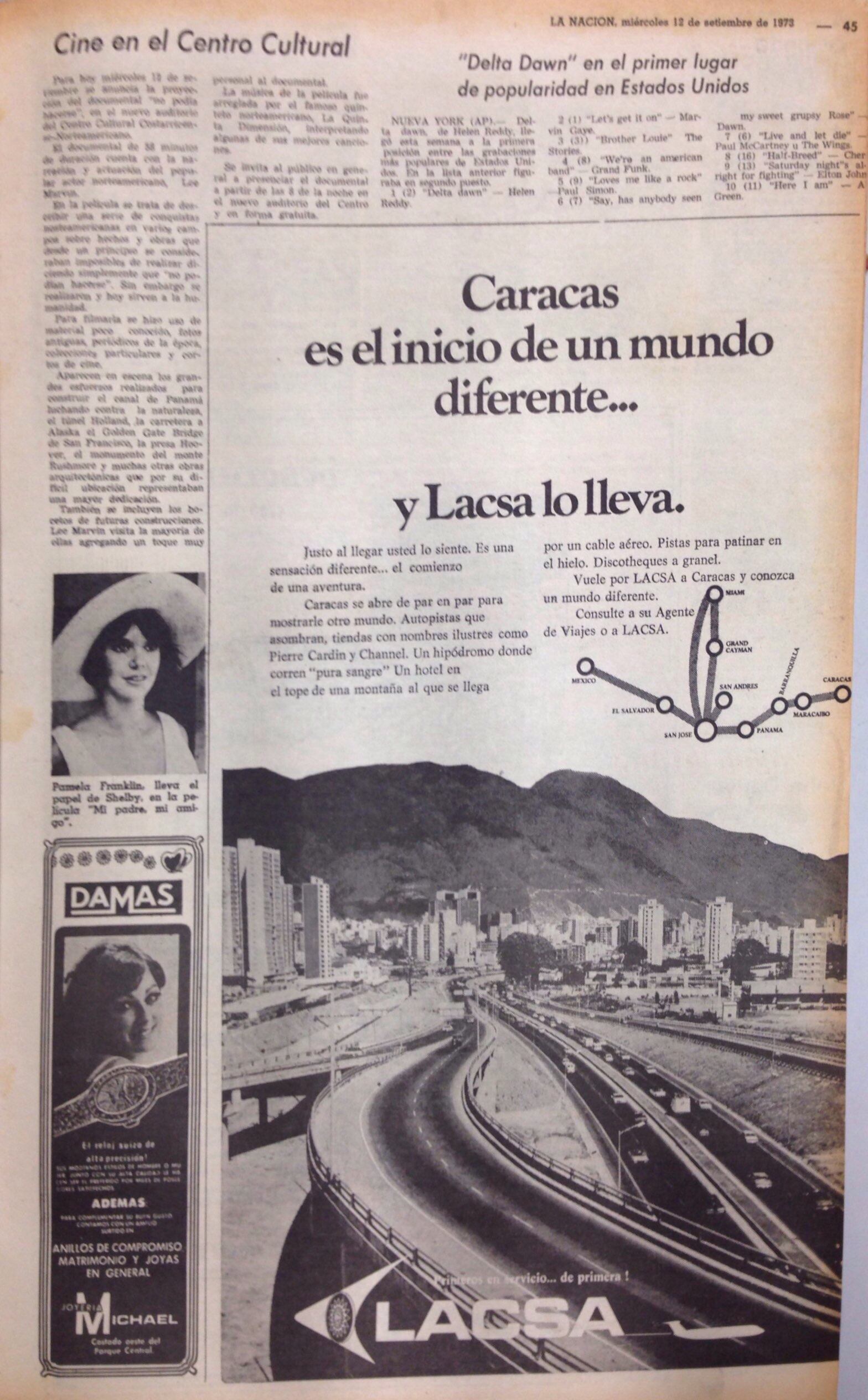 Anote esto: "¡Lacsa lo lleva!... Caracas se abre de par en par para mostrarle un mundo diferente...fabuloso, sensacional”, pregona entusiasta la antigua publicidad turística, que ocupaba casi una página entera.
