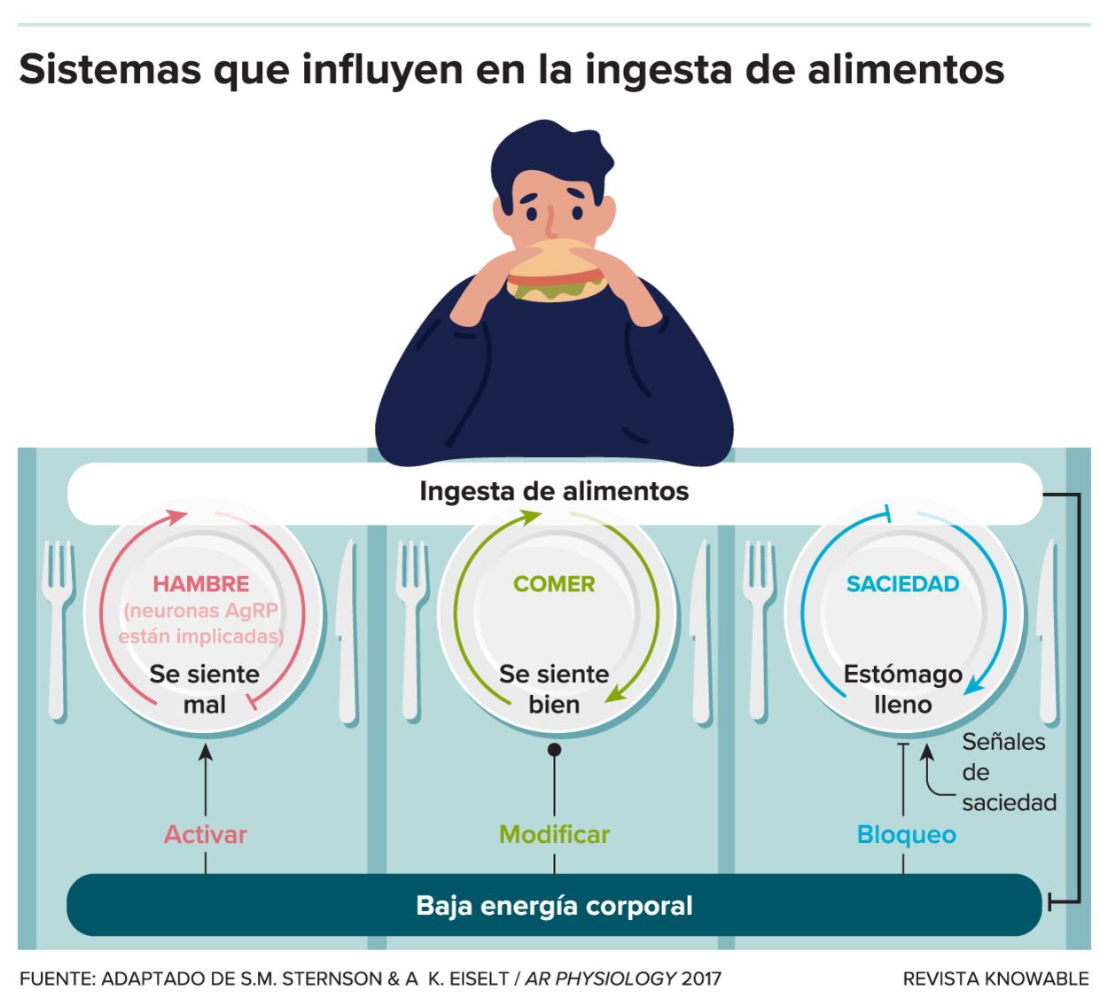 Estudios realizados en ratones han identificado un grupo de células denominadas neuronas AgRP, situadas cerca de la parte inferior del cerebro, que pueden provocar esta desagradable sensación de hambre. Se encuentran cerca del suministro de sangre al cerebro, lo que les da acceso a las hormonas procedentes del estómago y el tejido adiposo que indican los niveles de energía. Cuando la energía es escasa, actúan sobre otras áreas cerebrales para promover la alimentación.