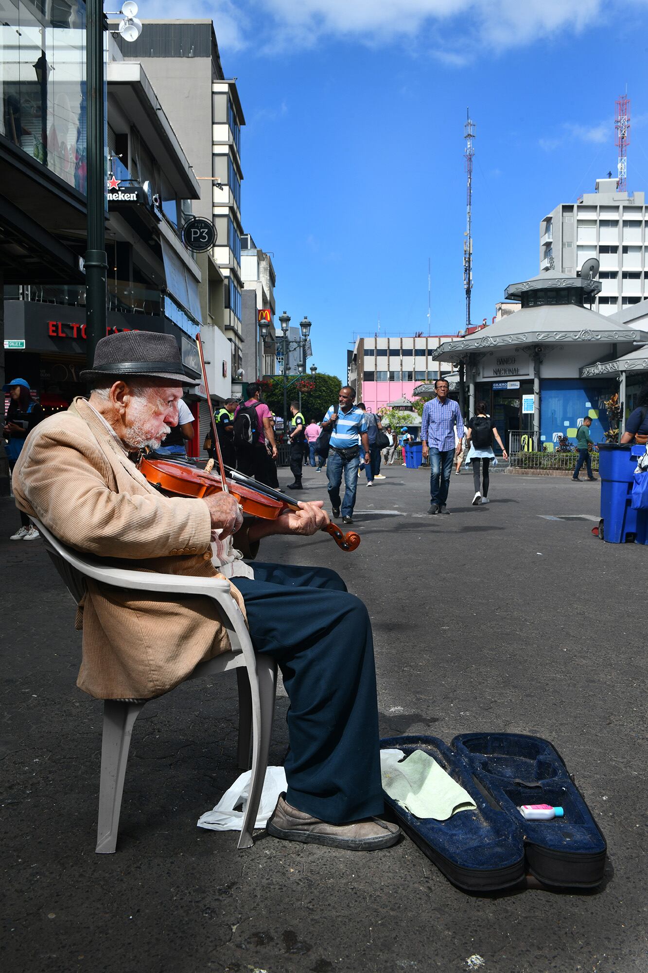Nuevos y viejos músicos, así como otros que “juegan" o dicen serlo, animan todos los días el paso acelerado de los costarricenses en la Avenida Central. Son la banda sonora de una capital que suena a arpa, a guitarra, a violín, a maracas o a marimba, una orquesta desperdigada por el mar de adoquines que todos los días lucha por vencer los pitos de los carros, las tiendas bulliciosas y los gritos insistentes de los vendedores ambulantes, pero sobre todo, la indiferencia.