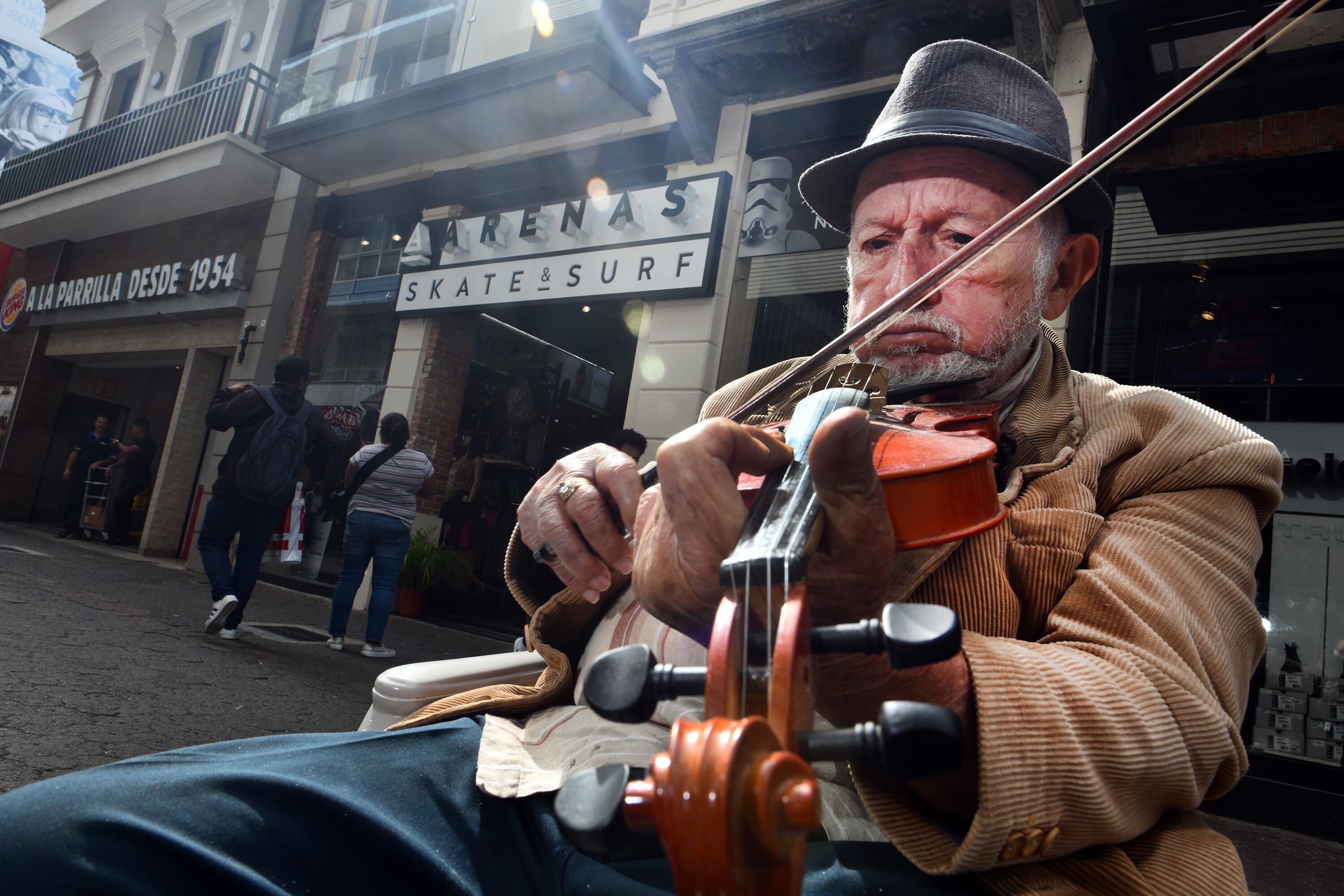 Don Justiniano, como casi todos los músicos callejeros de la capital, sobrevive con las monedas que le donan los transeúntes y una pensión no contributiva.
