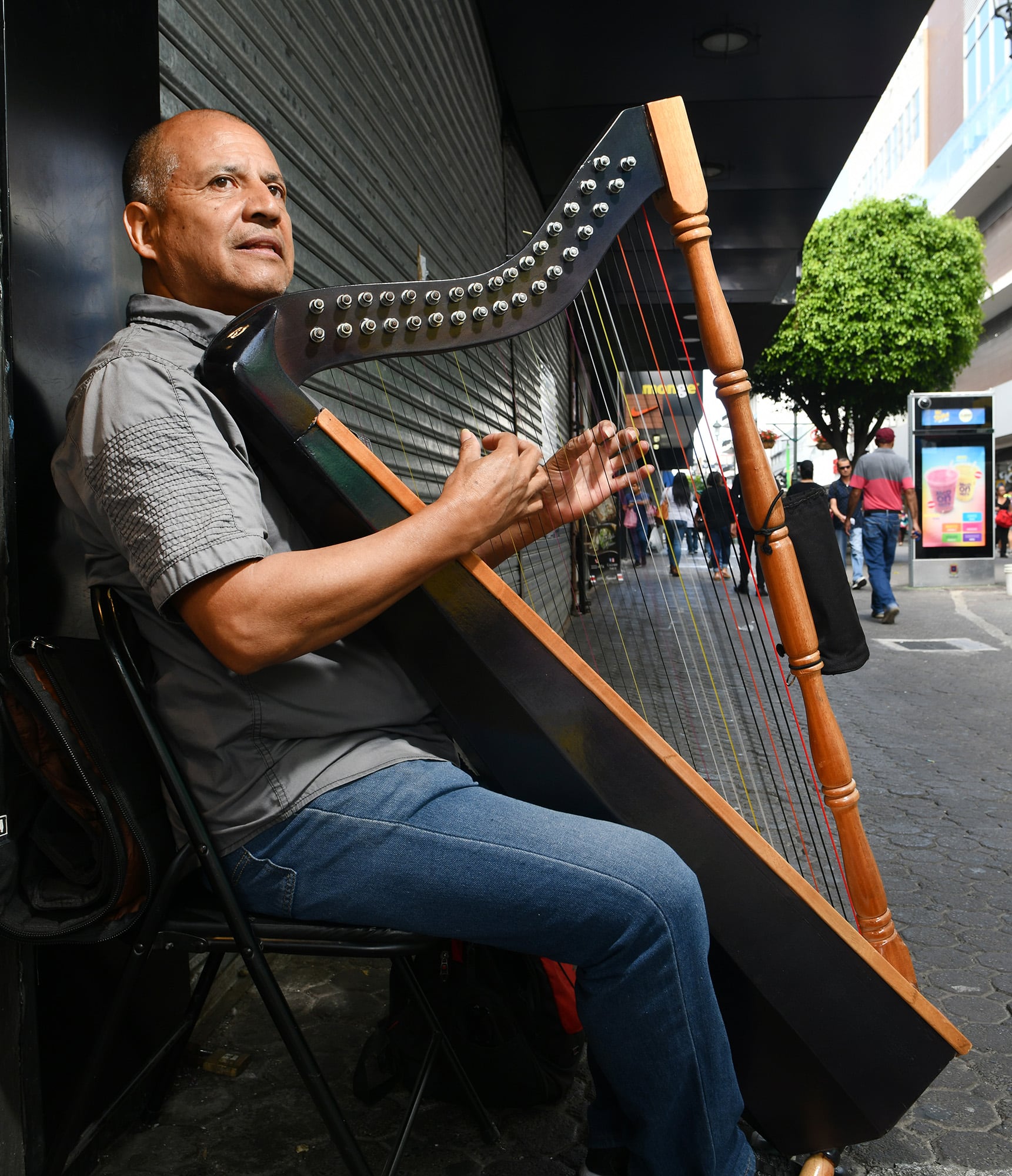 Mientras sus dedos parecen volar por las cuerdas del arpa, don Égdar cuenta que últimamente tocar en la calle no es tan buen negocio.