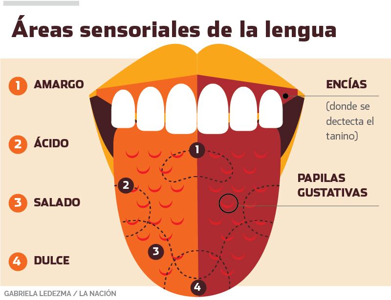 Los gustos del vino se revelan en secuencia, de acuerdo con la parte de la lengua que los detecta. Hay 5 características básicas que definen el perfil de un vino: dulzura, acidez, taninos, alcohol y cuerpo.