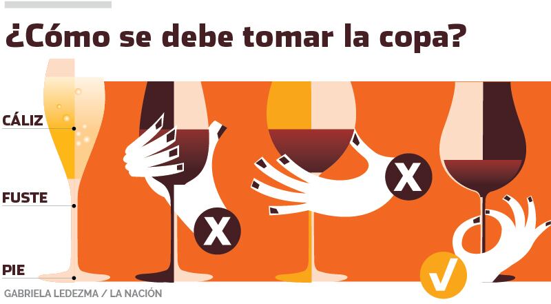 Las partes de la copa son la corona, el cáliz o vaso, el fuste y la base. Siempre debe tomarse por el fuste. Según explica Zamora esta costumbre viene desde siglos atrás cuando los reyes eran considerados deidades, por lo que debían tocar los objetos por el lugar que menos gente los hubiera tocado, en este caso, el fuste de la copa. Sin embargo, también hay una razón científica detrás: el cuerpo humano está a unos 36 grados centígrados, por lo que si un vino tinto, por ejemplo, debe estar a unos 18 grados, al tomar la copa por el vaso, el calor corporal hará que se evapore el alcohol y cambien las propiedades gustativas del vino.