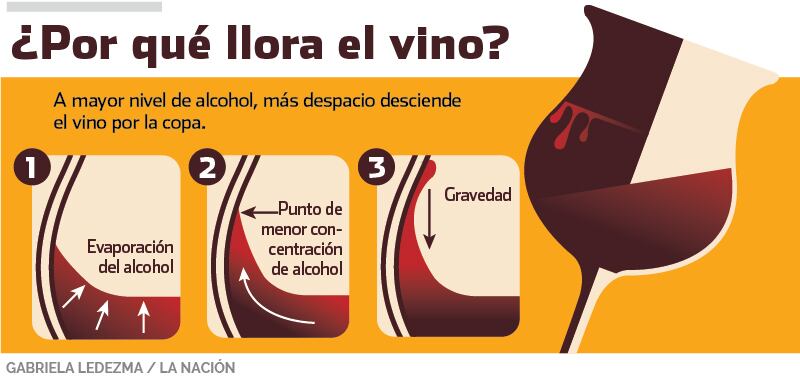 Las lágrimas del vino están relacionadas con la cantidad de alcohol. Si baja muy fácil es que tiene menos alcohol y entre más alcohol tenga, más despacio bajará por las paredes de la copa, dando la sensación de que el vino cae como lágrimas.