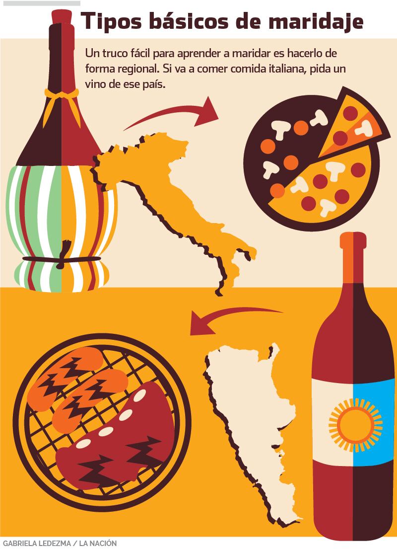 El maridaje o selección del vino correcto para los alimentos se ha convertido en todo un arte que merece un capítulo entero. No obstante, existen algunas recomendaciones básicas que lo pueden ayudar a salir de un apuro. En este caso se recomienda hacer un maridaje regional, es decir, si va a comer una pizza, sin duda, un vino italiano tiene altas posibilidades de combinar a la perfección con este platillo. Si va a comer paella, opte por un vino español; si son carnes, un vino argentino puede ser el adecuado y son unas alitas estilo buffalo, pida un vino californiano. Como se mencionó antes, ya está superada la regla de que el vino tinto va con carnes rojas y el blanco con carnes blancas, pero por ejemplo un plato como un ceviche o un carpaccio se puede combinar a la perfección con un Sauvignon Blanc o un Pinot Grigio que son más ligeros, mientras un Chardonnay, por su suntuosidad, iría bien con un platillo más cremoso independientemente de si se trate de carnes rojas o blancas. Además, con el apogeo de la gastronomía y la fusión entre distintas cocinas, la selección del vino puede resultar más complicada. El consejo es fijarse en los ingredientes del platillo y escoger un vino que tenga alguno de esos aromas en sus propiedades. No tenga miedo de preguntar o pedir ayuda al sommelier o los meseros. Puede ser la diferencia entre una comida inolvidable o una experiencia poco agradable.