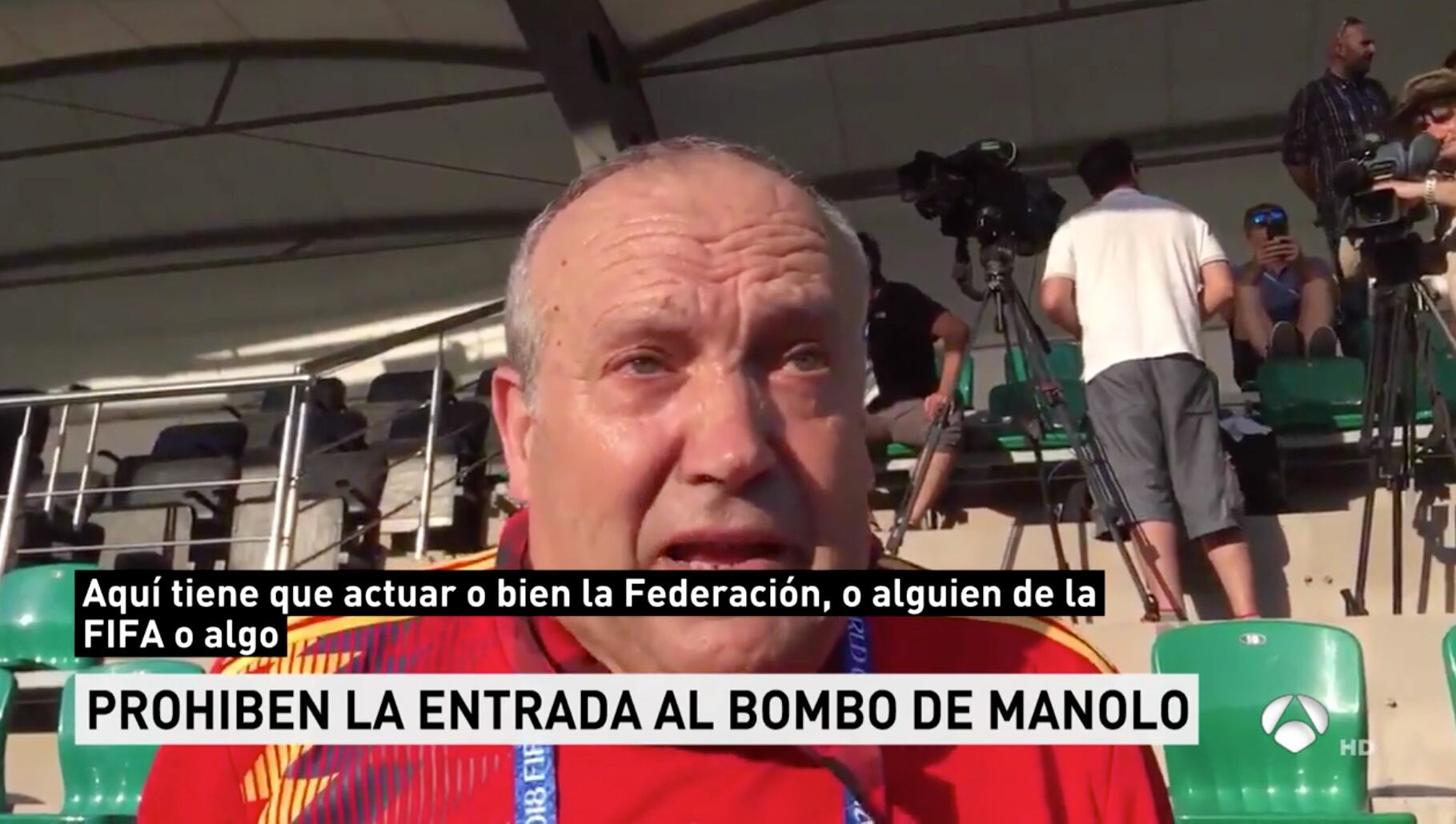 Las reglas de la Copa del Mundo 2018, efectivamente, prohibieron el ingreso de los aficionados con objetos ruidosos como silbatos, vuvuzelas o tambores. Obviamente, el bombo de Manolo está en esta última categoría, lo cual tiene al animador más famoso de la Selección de España “muy triste”, desolado más bien, según se mira en los videos que le están dando la vuelta al mundo en las últimas horas.