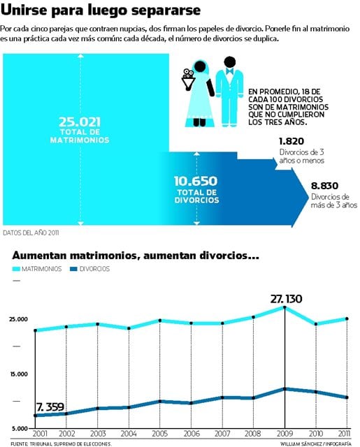 La citada cifra es un promedio de las separaciones –concretadas antes de que la unión alcanzara el tercer año– registradas entre el 2007 y el 2011. Los datos fueron proporcionados por la jefatura de inscripciones del Tribunal Supremo de Elecciones.