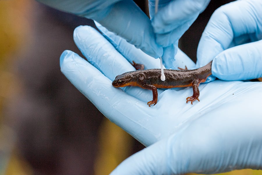 Otros anfibios pueden depender de bacterias simbióticas para obtener sus toxinas. En Estados Unidos, los tritones del género Taricha figuran entre los animales más tóxicos del país. Aunque parecen inofensivos, los tritones individuales de algunas poblaciones de estas antiguas criaturas contienen suficiente tetrodotoxina para matar a numerosas personas. Muchos científicos creían que los tritones producían la toxina por sí mismos. Pero cuando un equipo de investigadores recogió bacterias de la piel de los tritones y cultivó cepas microbianas individuales, descubrió cuatro tipos de bacterias productoras de tetrodotoxina en la piel de los anfibios. Esto es similar a lo que ocurre con otras especies que contienen tetrodotoxina, como los cangrejos y los erizos de mar, donde los científicos coinciden en que las bacterias son la fuente de la toxina.