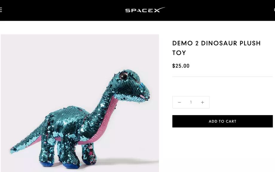 Tiempo después del despegue del cohete, la plataforma del Space X puso a la venta una copia del dinosaurio. Se puede comprar por $25.