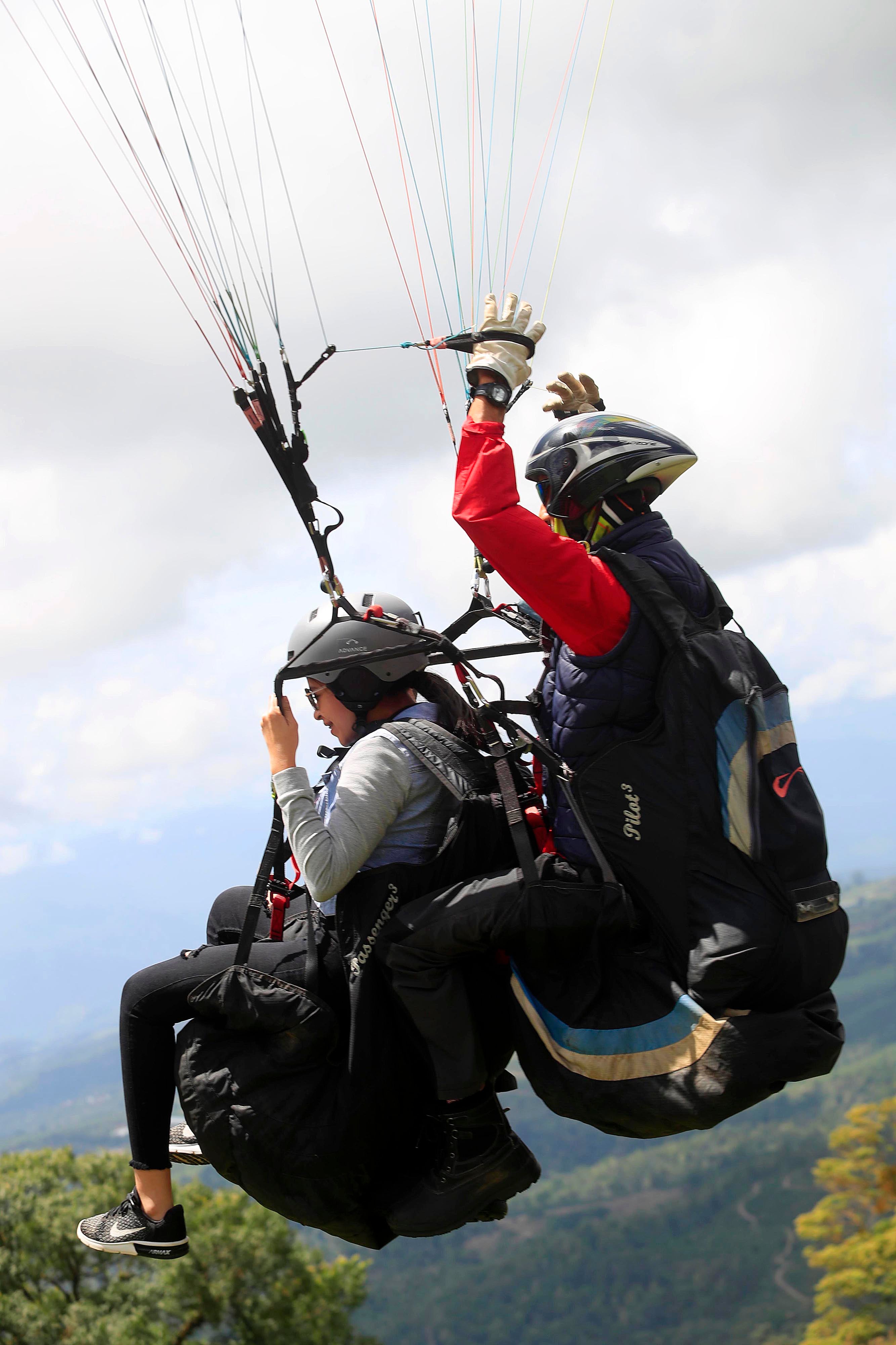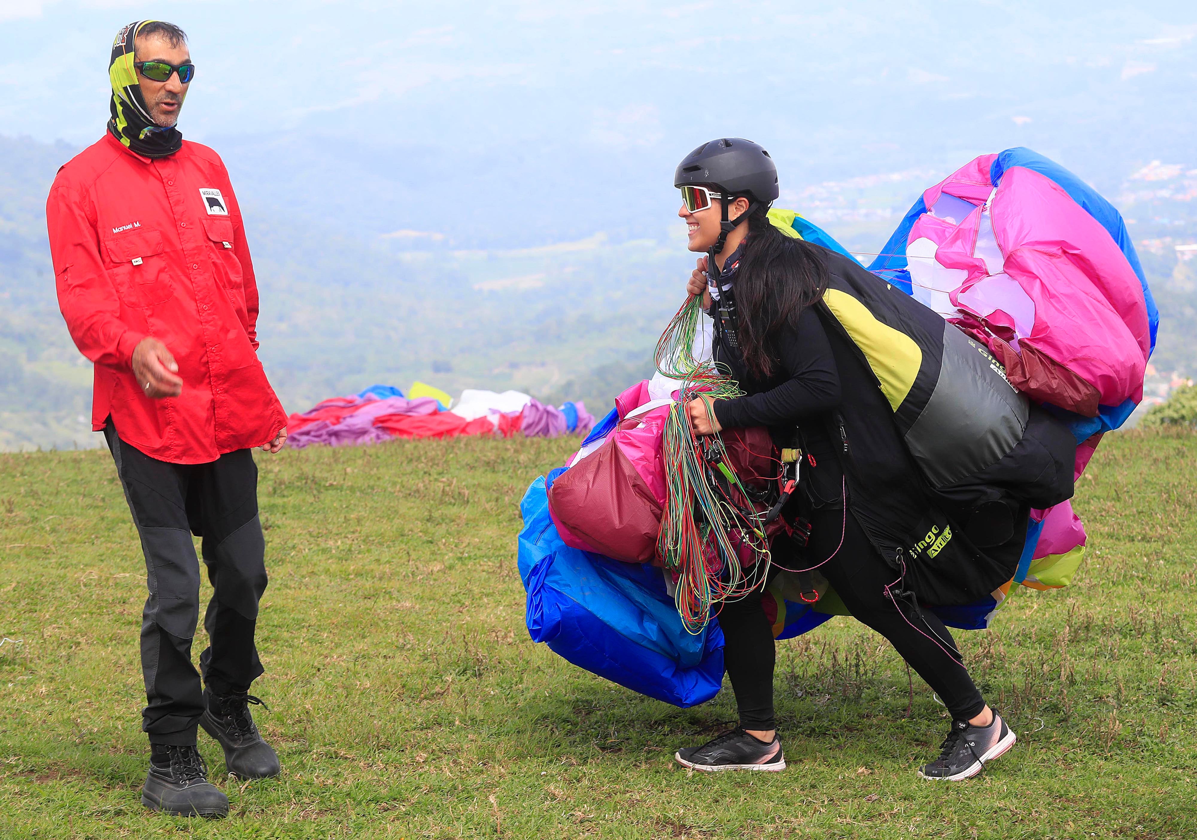 Aquí todos disfrutan, sin excepción. Karen Cruz Álvarez puede dar fe de ello, pues viajó desde Hatillo 1 con unos amigos para disfrutar como niña de su primera experiencia en parapente. Ella es, precisamente, quien acompaña a Manuel Montoya durante el primer despegue del día.