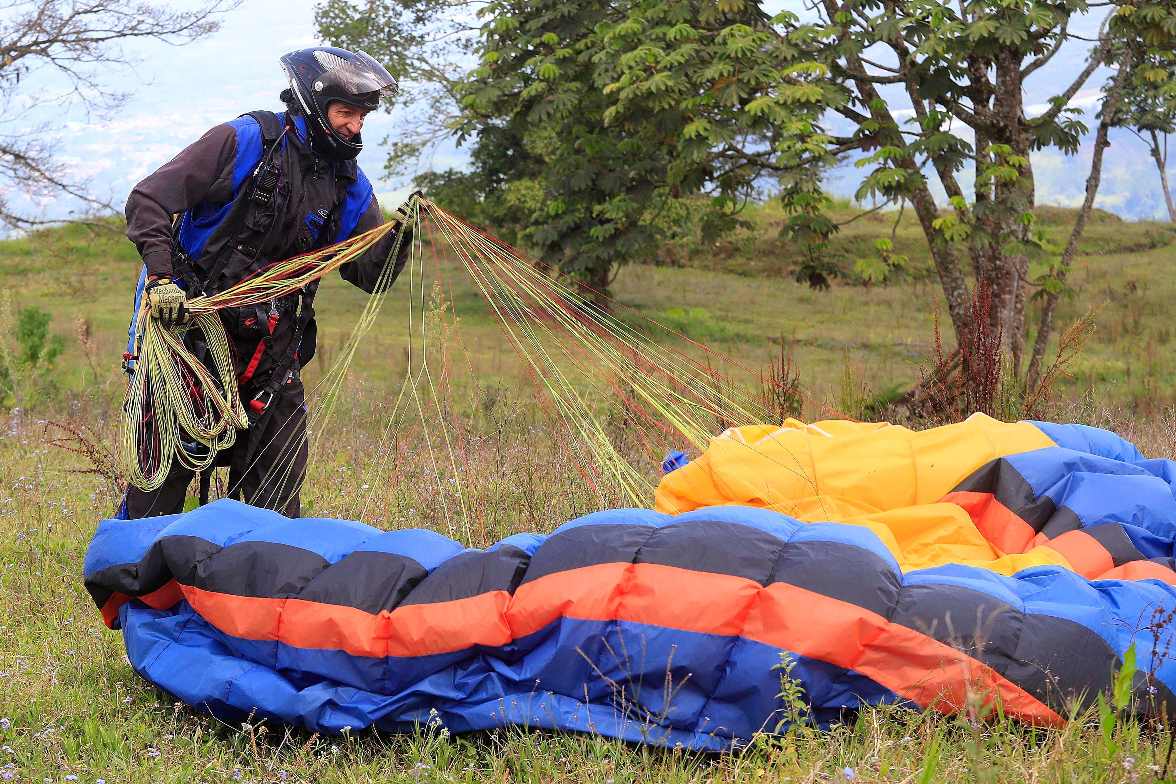 De las cajuelas de los carros, los aventureros sacan los paracaídas de emergencia, las sillas de vuelo o arnés y los coloridas velas. Y tan pronto como llegan, están listos los primeros pilotos y acompañantes para la acción.