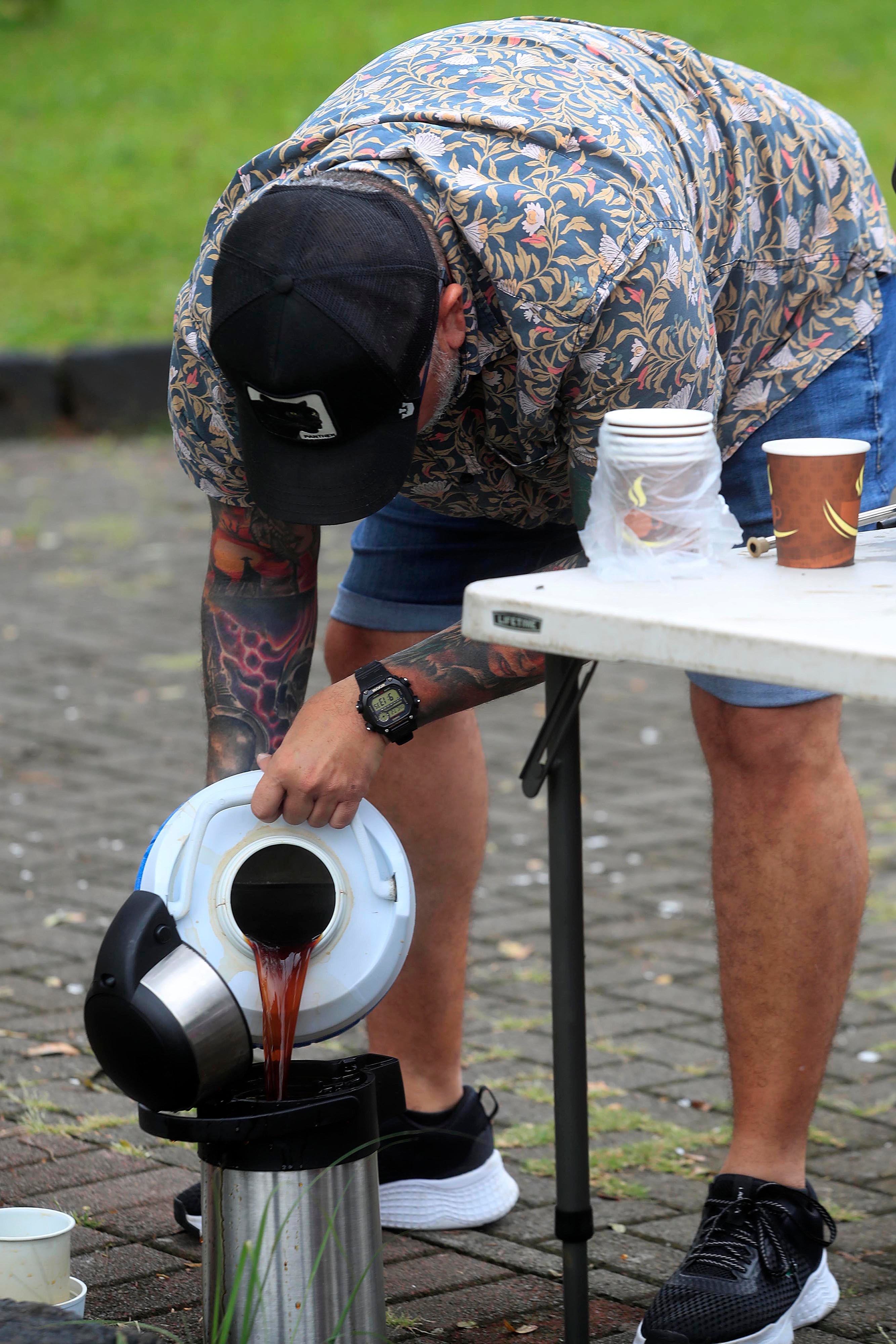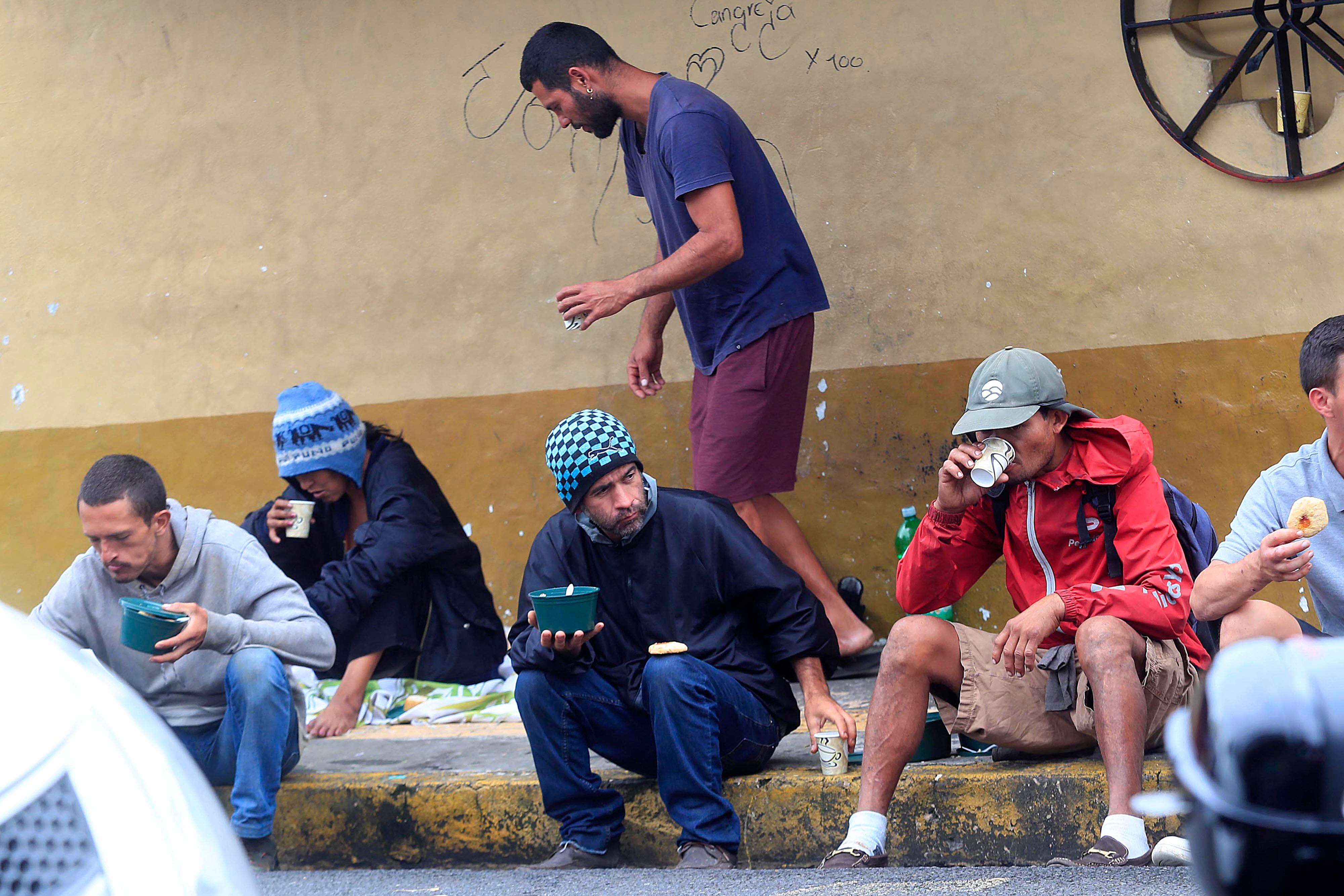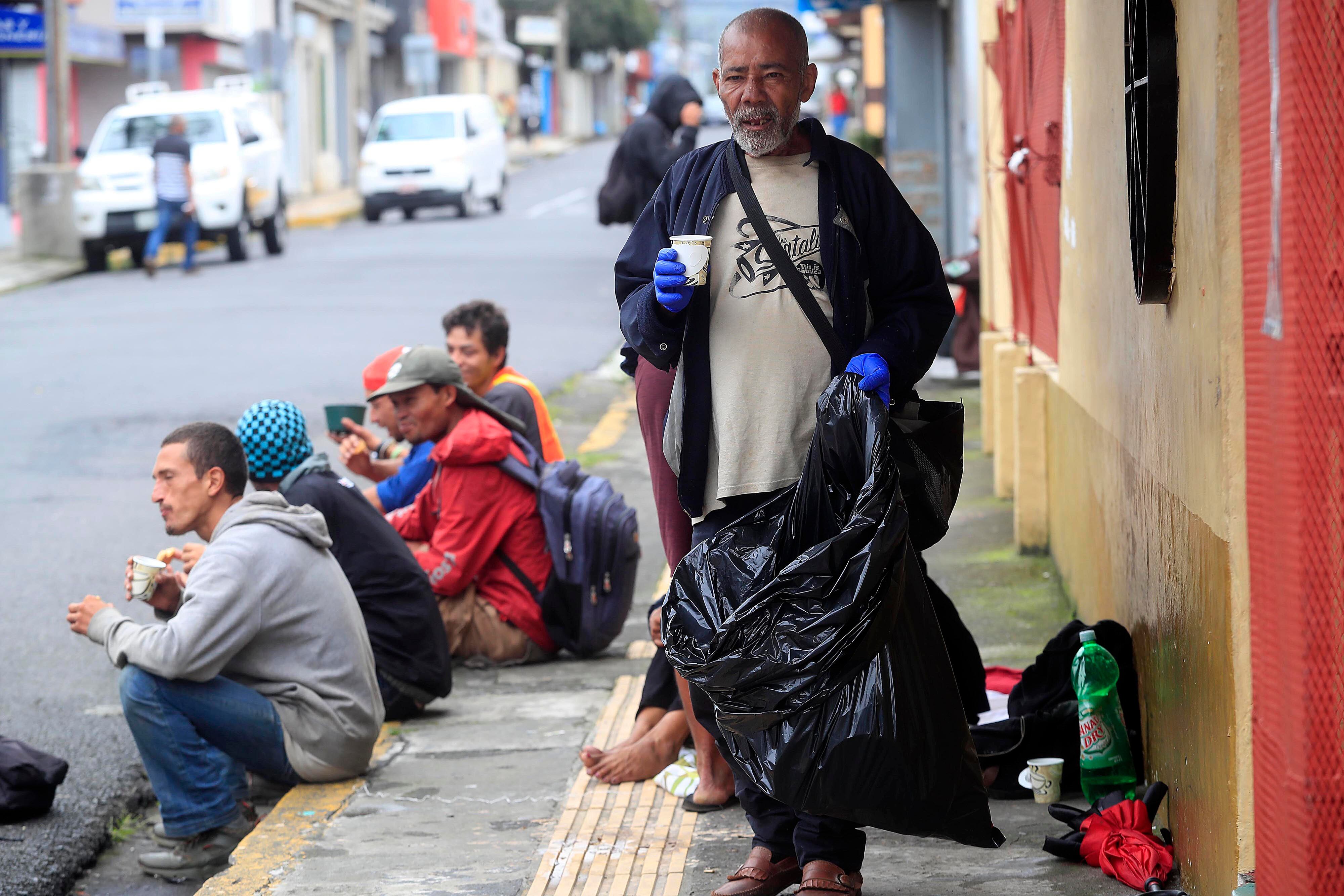 Sentado a la orilla de la acera, saborea su desayuno pues dice que como habitantes de la calle suelen pasar hambre. Llegó antes de las 7 a. m. a hacer fila y por eso estaba entre los primeros.