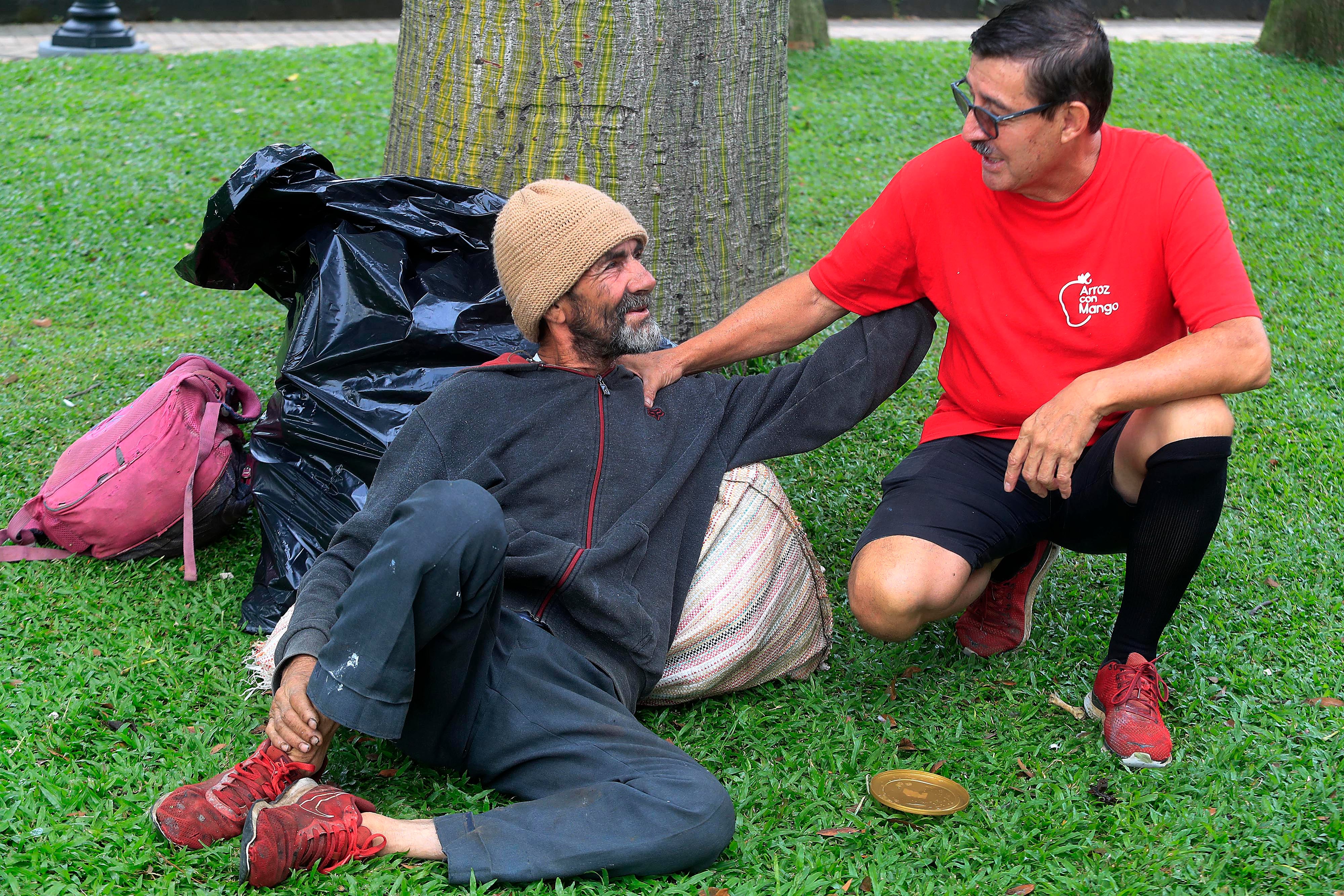 Al fondo del parque, recostado sobre un árbol, con dos bolsas negras de basura al lado, don Carlos Solís solamente observa la escena. Él también está allí esperando el desayuno, pero no hace fila.